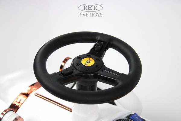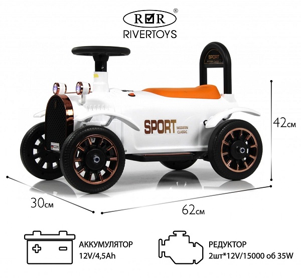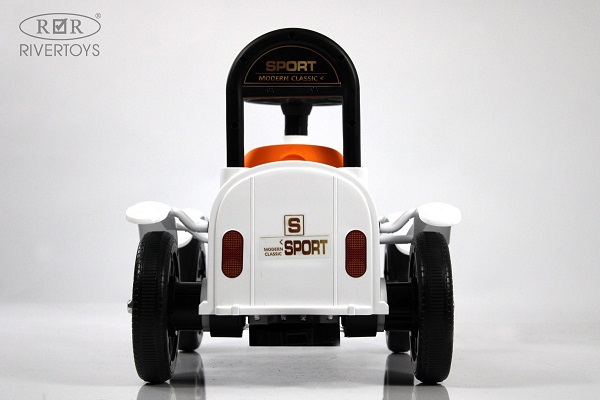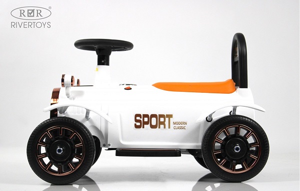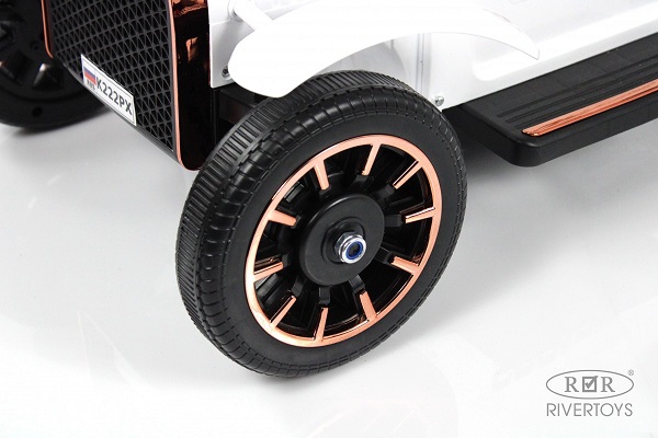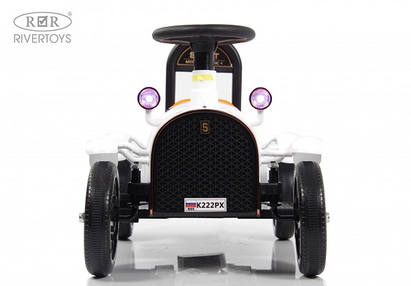 Детский электромобиль Rivertoys K222PX - стильная электромашина для ребенка от 1 годика в ретро стиле. Дизайн машины продуман до мелочей - это и плавные линии корпуса, и круглые оригинальные фары, которые светятся, оригинальные "бронзовые" элементы на колесах и корпусе машинки.