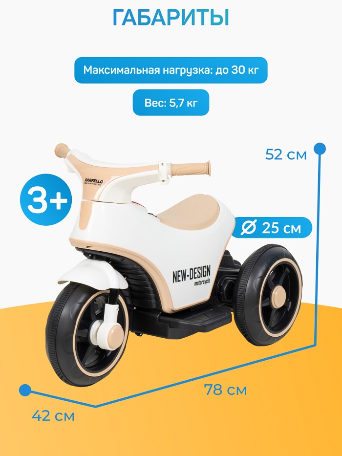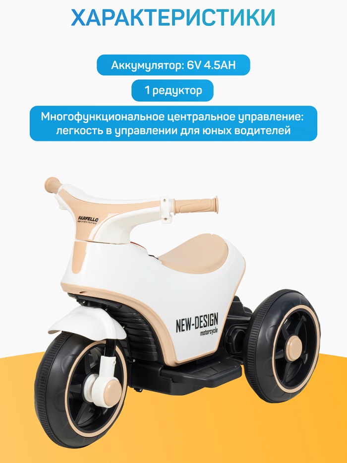 Детский электромобиль трицикл Farfello JJ1213 (Фарфелло) - яркий, стильный, интересный детский трицикл для увлекательных прогулок и поездок на улице и дома. Небольшой и легкий электроцикл отлично подойдет для детей от 2 лет. Прост в управлении и позволит ребенку освоить навыки управления транспортом. Позволит развить внимательность, координацию, укрепить ноги и руки.