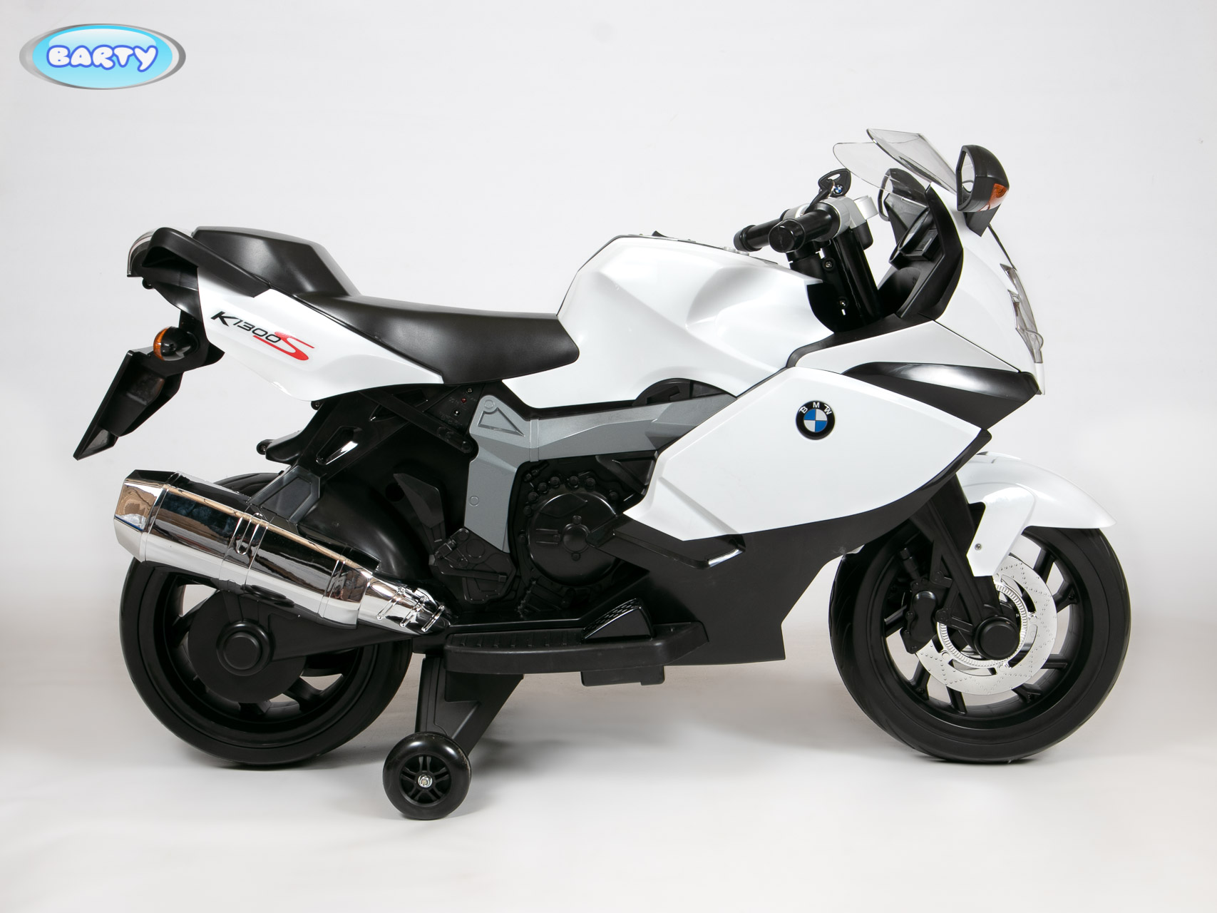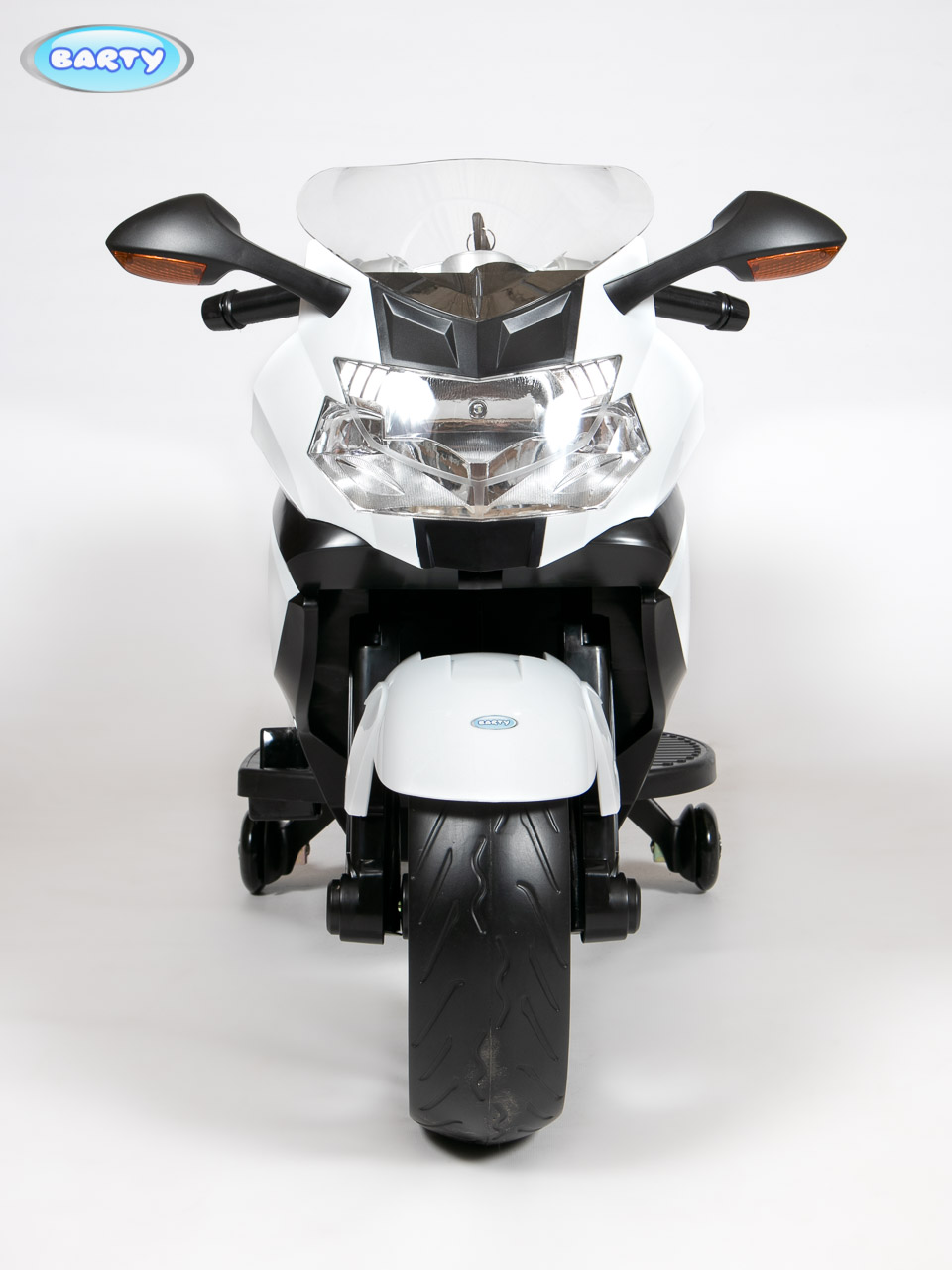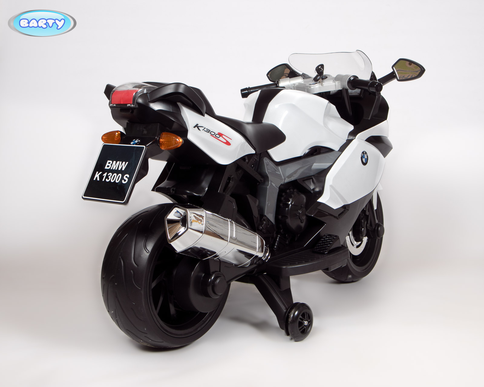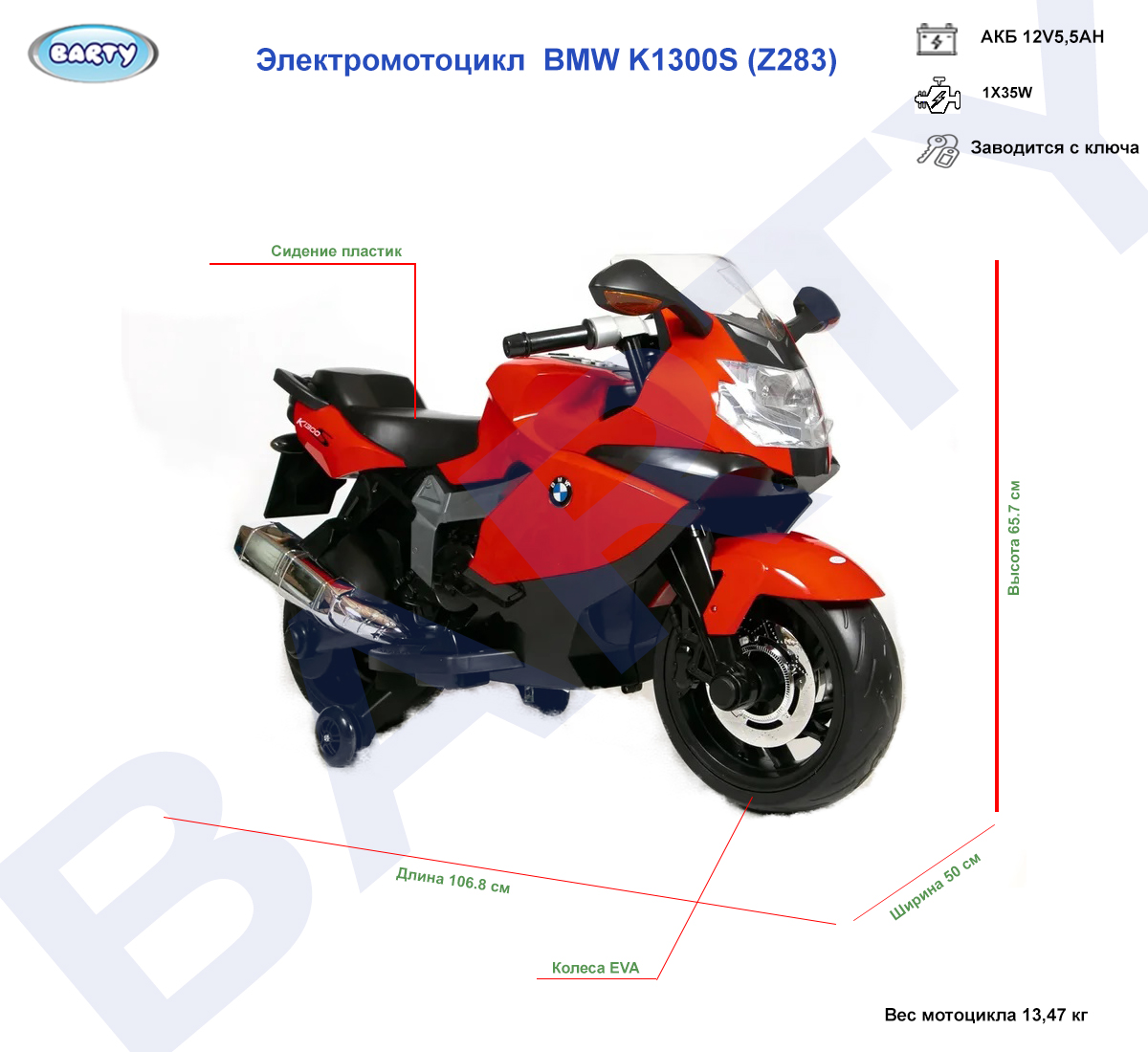 Детский электромотоцикл Barty BMW K1300S Z283 (Барти БМВ) - лицензионный детский мотоцикл для ребенка от 3 до 7 лет. Детский мотоцикл стилизован под настоящий байк BMW. Ребенка ждут увлекательные и интересные поездки на мощном и спортивном мотоцикле с большим ветровым стеклом, хромированной выхлопной трубой и другими элементами как у настоящего байка. Большие каучуковые колеса отлично справляются с неровностями на дороге и имеют дополнительную устойчивость за счет увеличенной ширины колес. Для детей, которые только начинают осваивать поездки на мотоцикле, предусмотрены дополнительные небольшие колеса по бокам. Заводится мотоцикл при помощи ключа, а за ход мотоцикла отвечает кнопка на удобной платформе для ног. Данная кнопка отвечает за газ и тормоз. При нажатии на нее мотоцикл едет, убрать ногу с педали- остановить мотоцикл. Мотоцикл может ездить вперед и назад, при этом скорость набирается плавно, без рывком , что очень важно для безопасности ребенка. Максимальная скорость у модели 7 км/час а батареи хватит на примерно 120 минут .