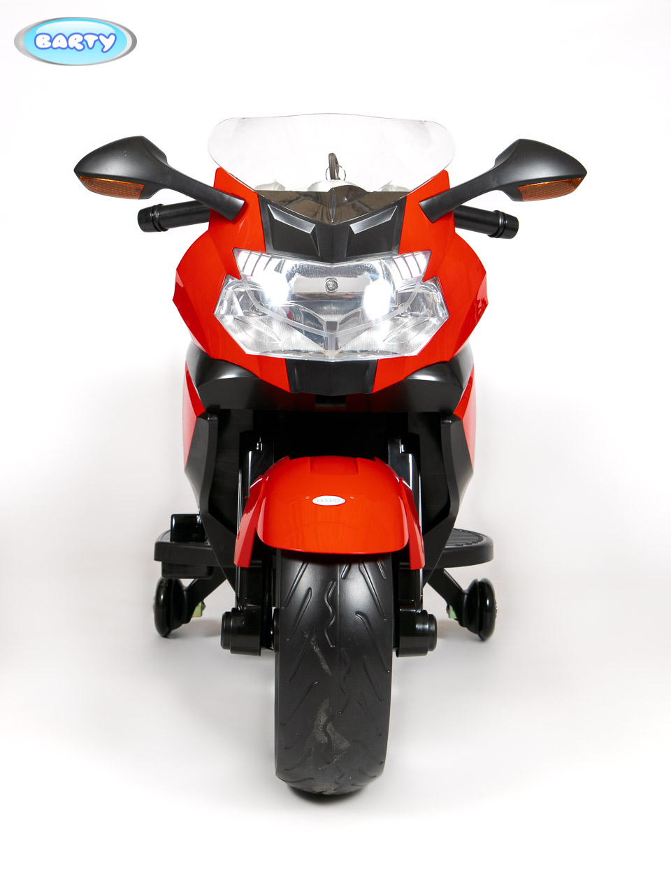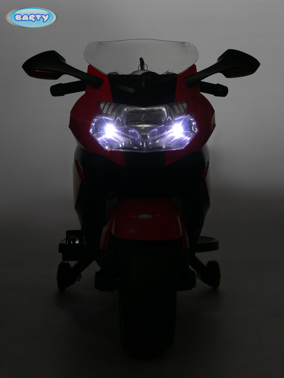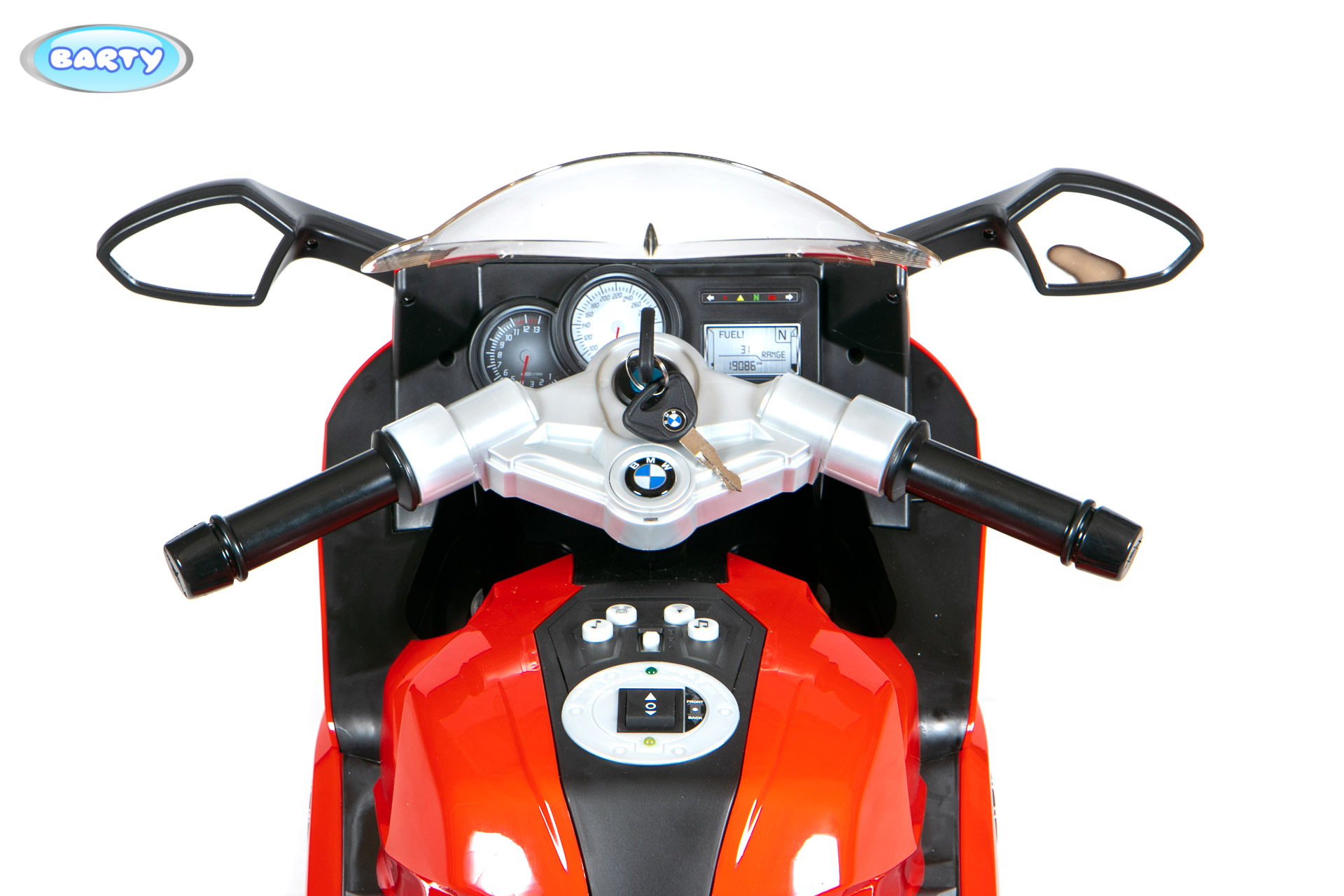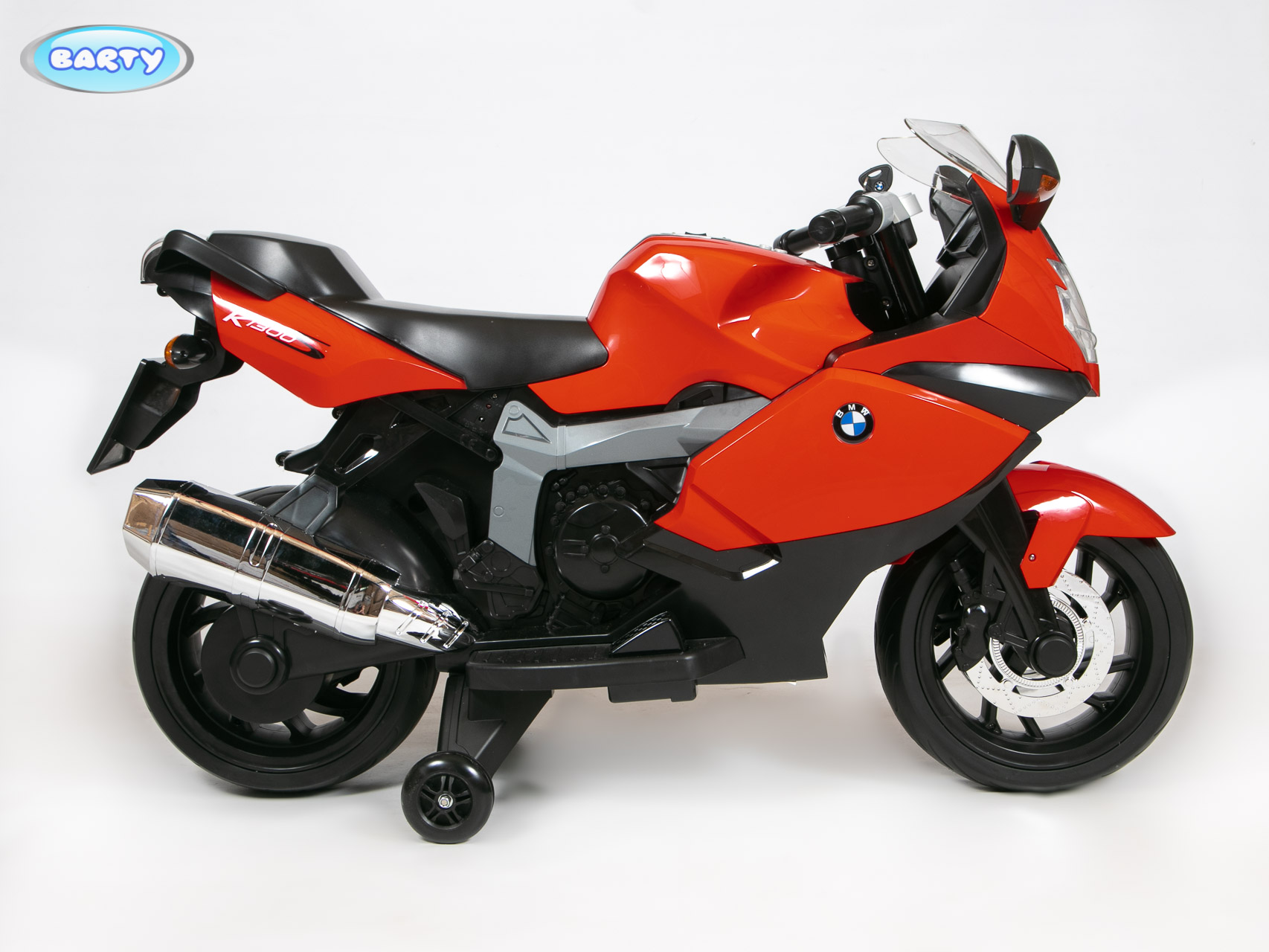 Детский электромотоцикл Barty BMW K1300S Z283 (Барти БМВ) - лицензионный детский мотоцикл для ребенка от 3 до 7 лет. Детский мотоцикл стилизован под настоящий байк BMW. Ребенка ждут увлекательные и интересные поездки на мощном и спортивном мотоцикле с большим ветровым стеклом, хромированной выхлопной трубой и другими элементами как у настоящего байка. Большие каучуковые колеса отлично справляются с неровностями на дороге и имеют дополнительную устойчивость за счет увеличенной ширины колес. Для детей, которые только начинают осваивать поездки на мотоцикле, предусмотрены дополнительные небольшие колеса по бокам. Заводится мотоцикл при помощи ключа, а за ход мотоцикла отвечает кнопка на удобной платформе для ног. Данная кнопка отвечает за газ и тормоз. При нажатии на нее мотоцикл едет, убрать ногу с педали- остановить мотоцикл. Мотоцикл может ездить вперед и назад, при этом скорость набирается плавно, без рывком , что очень важно для безопасности ребенка. Максимальная скорость у модели 7 км/час а батареи хватит на примерно 120 минут .