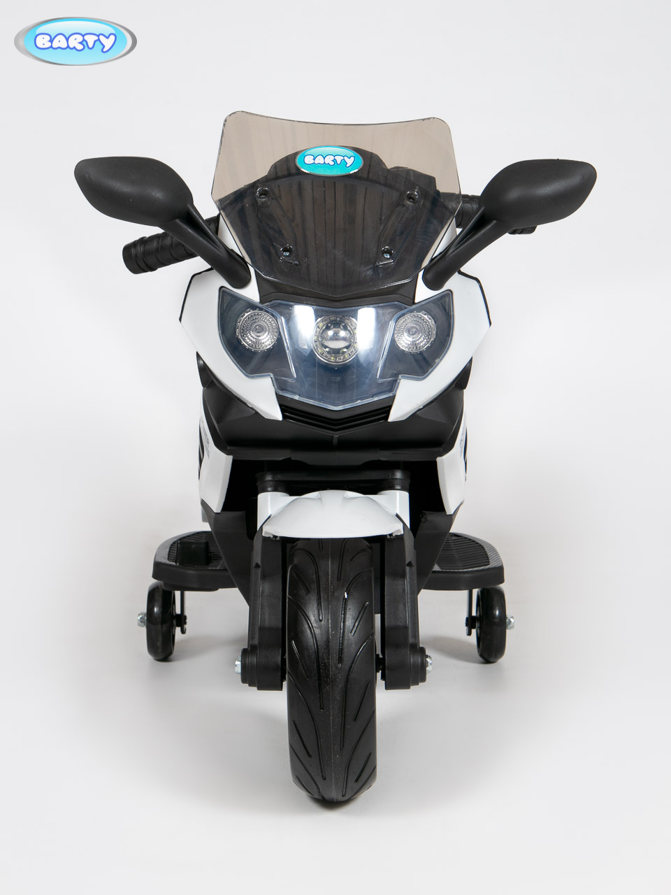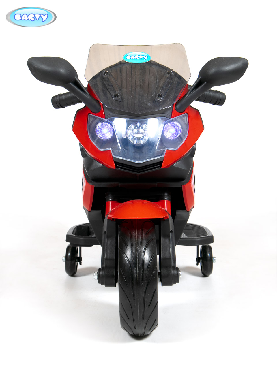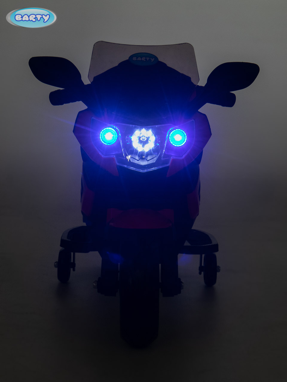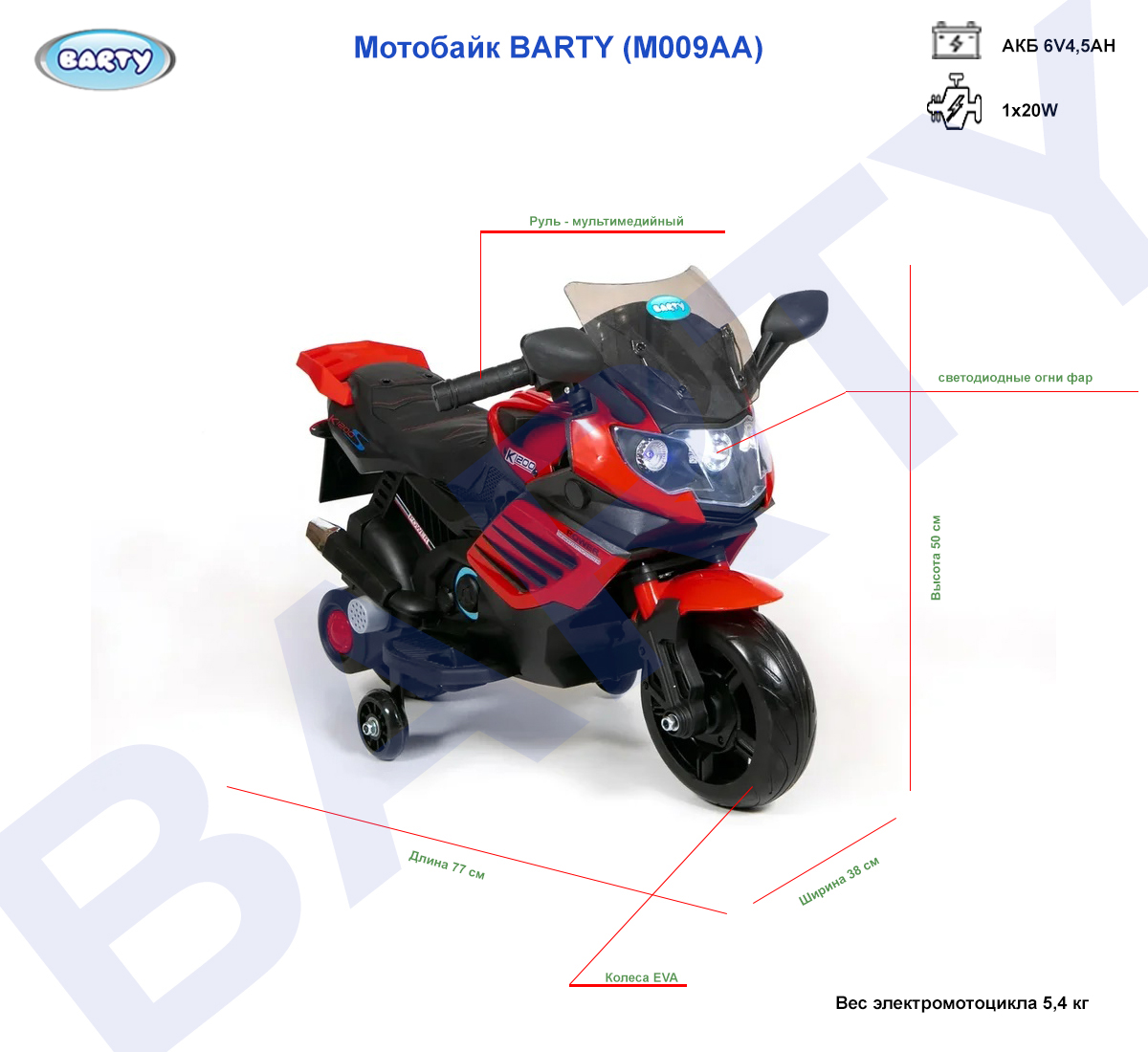 Детский электромотоцикл BARTY M009AA (барти м009аа) - мотоцикл для детей от 3 до 6 лет станет прекрасным подарком на любой праздник. Благодаря глянцевой поверхности, которая переливается на солнце, мотоцикл привлечет внимание всех детей в парке или на игровой площадке. Внешняя красота – не единственное достоинство мотобайка. Данная модель оснащена одним двигателем 20 W и аккумулятором 6V4,5 Ah. Родители могут не переживаться за безопасность ребенка, байк плавно трогается с места и может разогнаться до 3 км/ч. У мотобайка по бокам есть страховочные колеса. Так ребенок сможет научиться держать «железного коня» в равновесии. Глубокий протектор, резиновые колеса EVA, задний привод – такими характеристиками может похвастаться разве что байк папы .Юный водитель сможет кататься на мотобайке не только по асфальту, но и парковой зоне. Данная модель заводится с кнопки. Во время прогулки в темное время суток ребенок сможет осветить путь фарами.