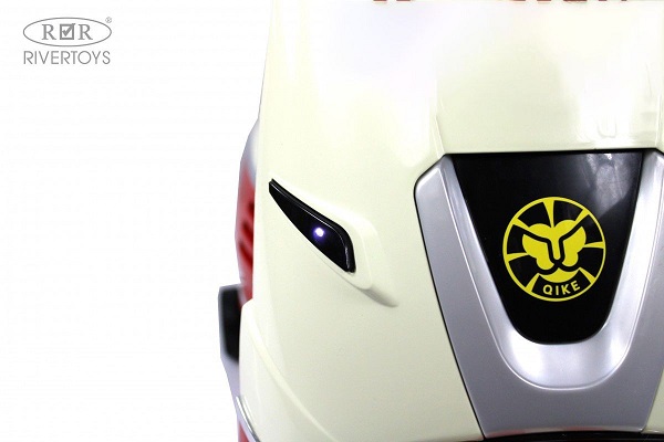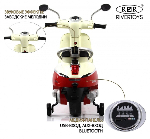 Для большей реалистичности у электроскутера зажигаются передние и задние фары, есть заводские мелодии, индикатор зарядки, USB, AUX, Bluetooth.