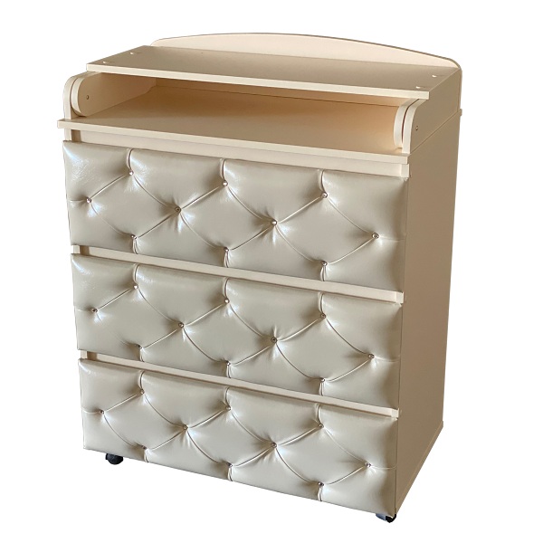 Пеленальный комод Антел Ульяна с мягким фасадом - элегантный комод с мягкой обивкой и стразами. Такой комод станет не только удобным местом для хранения вещей и удобной пеленальной поверхностью, но и красивым украшением любой комнаты. Мягкая обивка с каретной стяжкой смотрится эффектно и очень интересно. Все ящики оснащены современными направляющими, которые сделают пользование ящиками тихим и безопасным. На верхней части комода размещен пеленальный столик, который поможет в уходе за ребенком в первые месяцы после его рождения. В дальнейшем столик можно сложить в дополнительную полочку или снять столик полностью.
