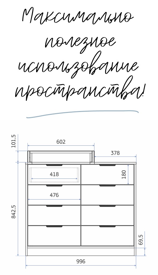 - Большой комод с 8 ящиками полного выдвижения и увеличенной глубиной.