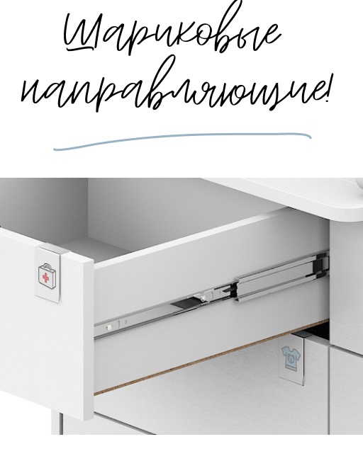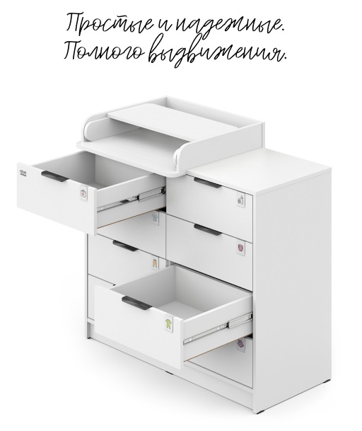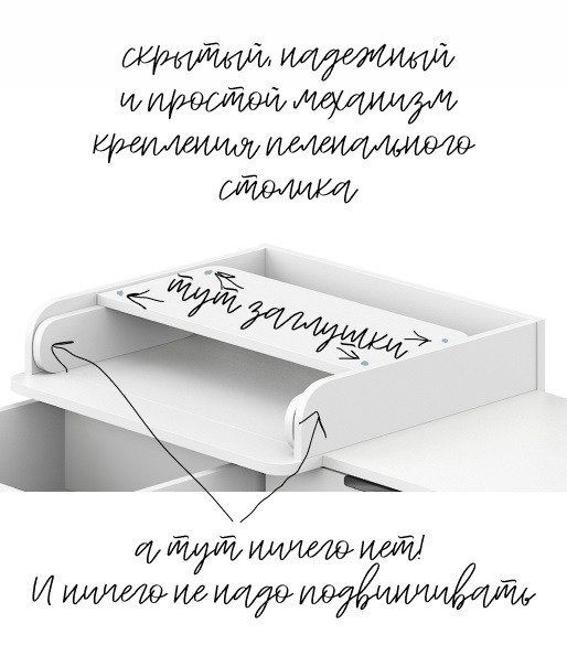 - Съемный, раскладной пеленальный столик. Устанавливается с любой стороны комода (справа, слева, посередине). Снимается без следов!