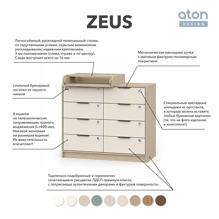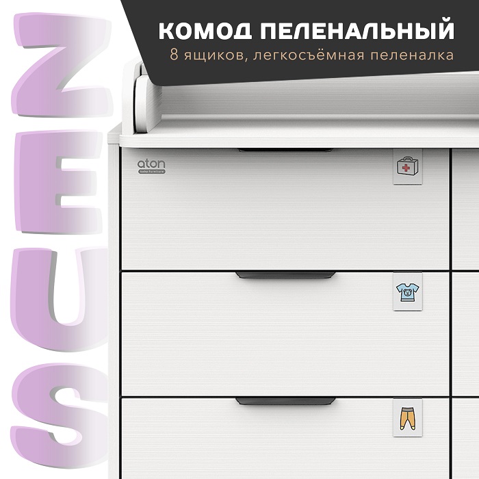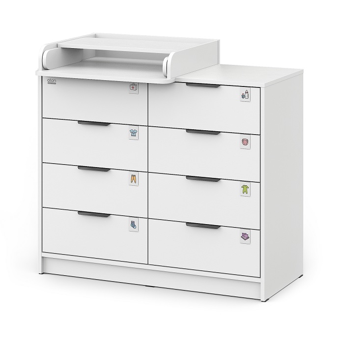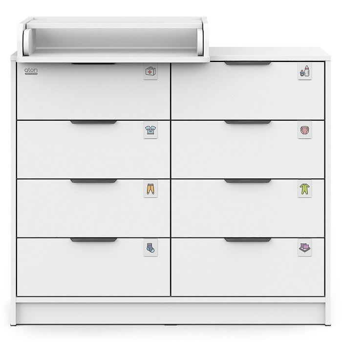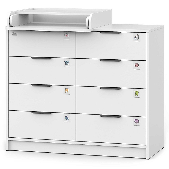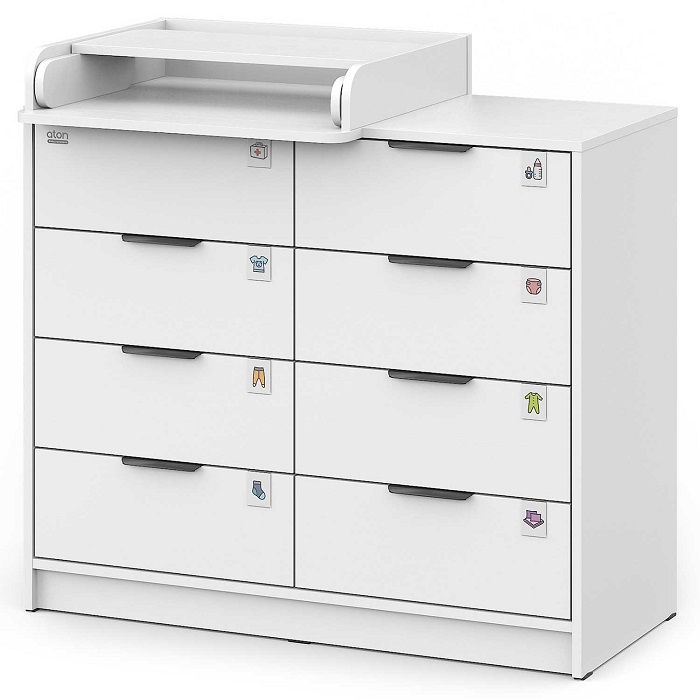 Комод Атон Zeus ЛДСП 1000/8 (атон зевс) - большой, очень вместительный и практичный комод с ярлыками на ящиках и съемным пеленальным столиком. Отличный вариант для удобного и понятного хранения детских вещей, аптечки, игрушек.