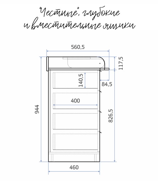 Комод имеет ширину 100 см и оснащен 8 вместительными выдвижными ящиками. Каждый ящик оснащен телескопическими направляющими полного выдвижения, что позволяет тихо и бесшумно выдвигать и задвигать ящик, а так же позволит ящику выдерживать большие нагрузки. Ящики увеличенного объема– в глубину высота боковых стенок– 14 см.