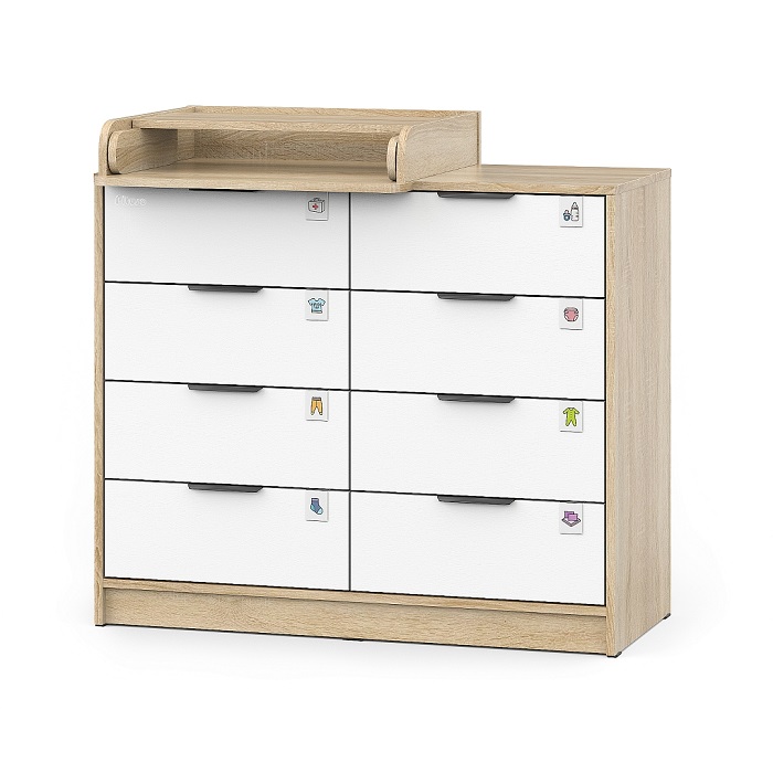 В комплекте с комодом идут специальные прозрачные пластиковые шильдики, которые, при желании, одеваются сверху на фасад. В них можно вставить любые картинки или рисунки. Базовый набор ярлычков-картинок принадлежностей для новорожденных в комплекте.