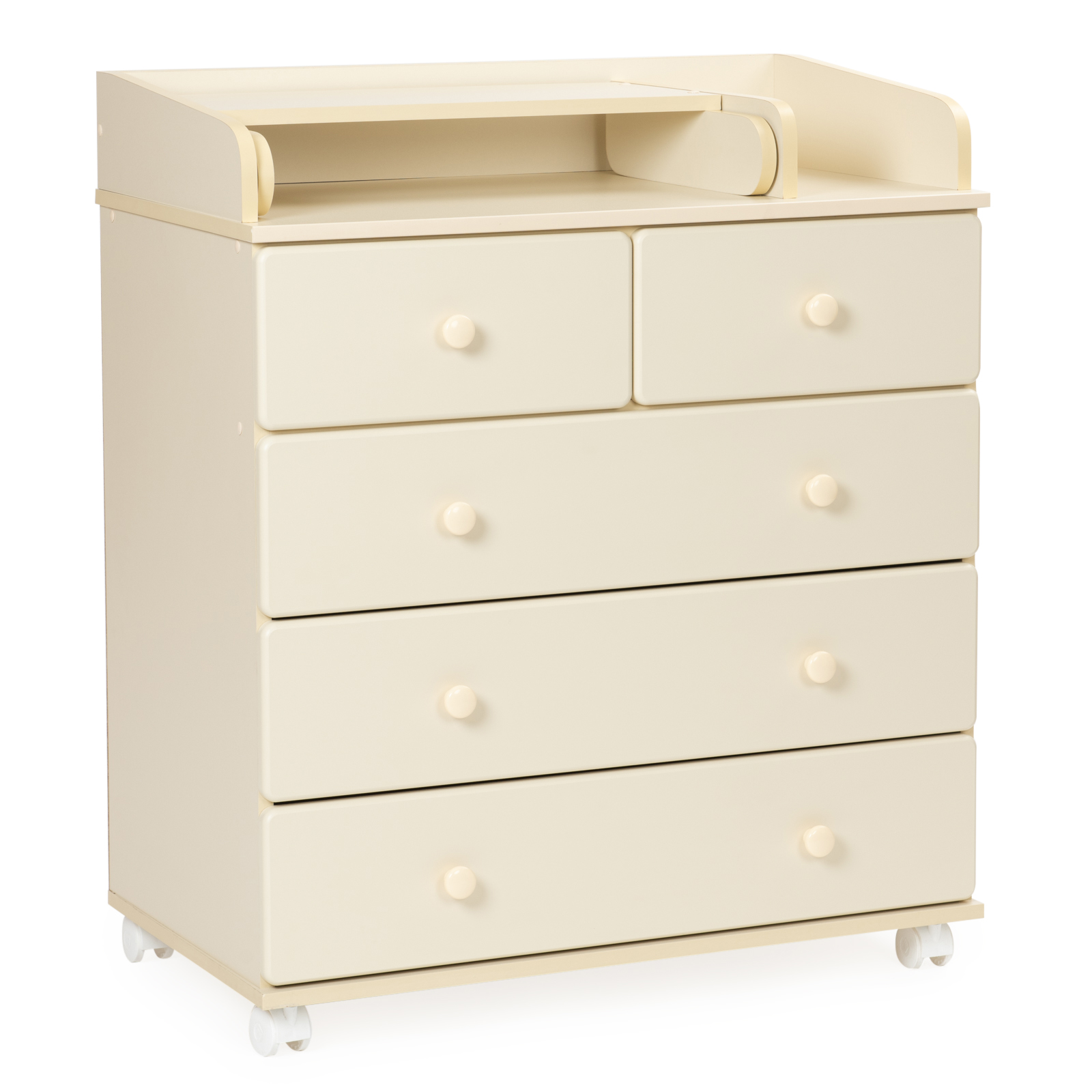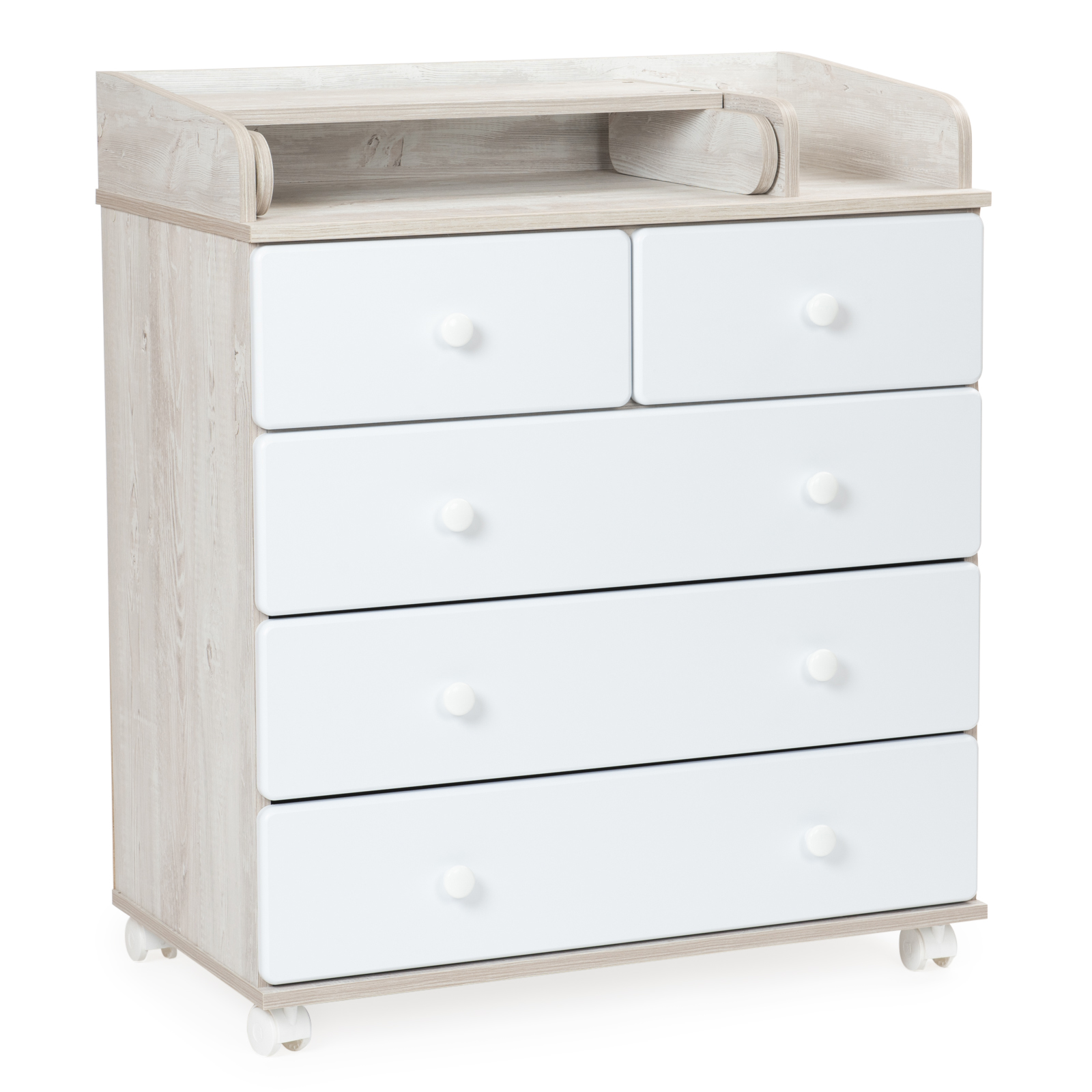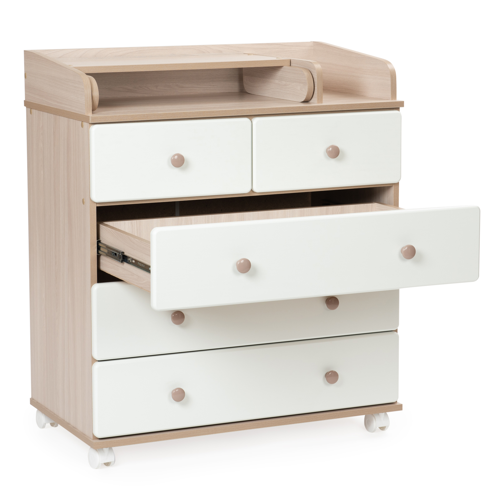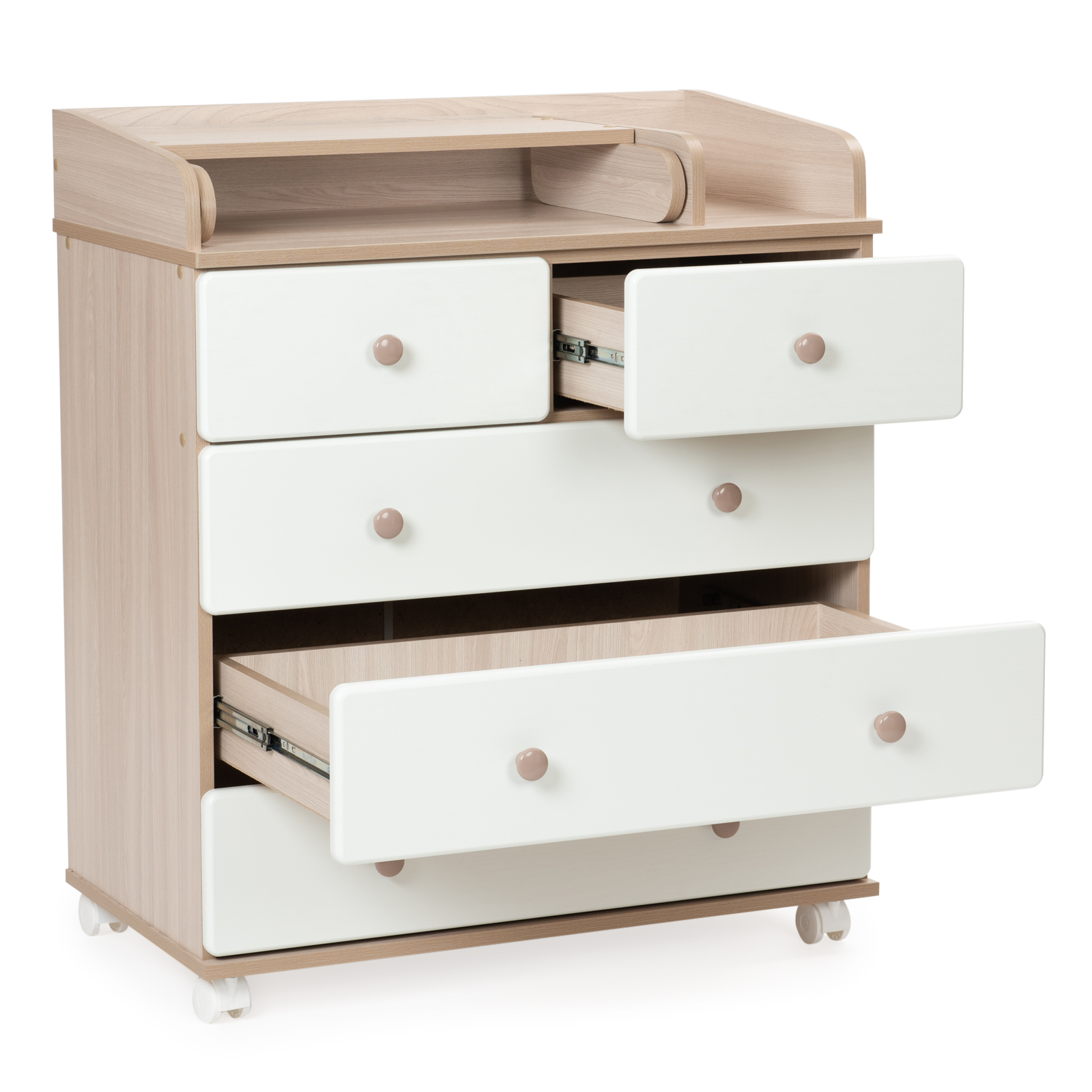 Комод оборудован пеленальным столиком с простым и надежным механизмом раскладывания, 5 вместительных ящика и 4-е колёса со стопором.