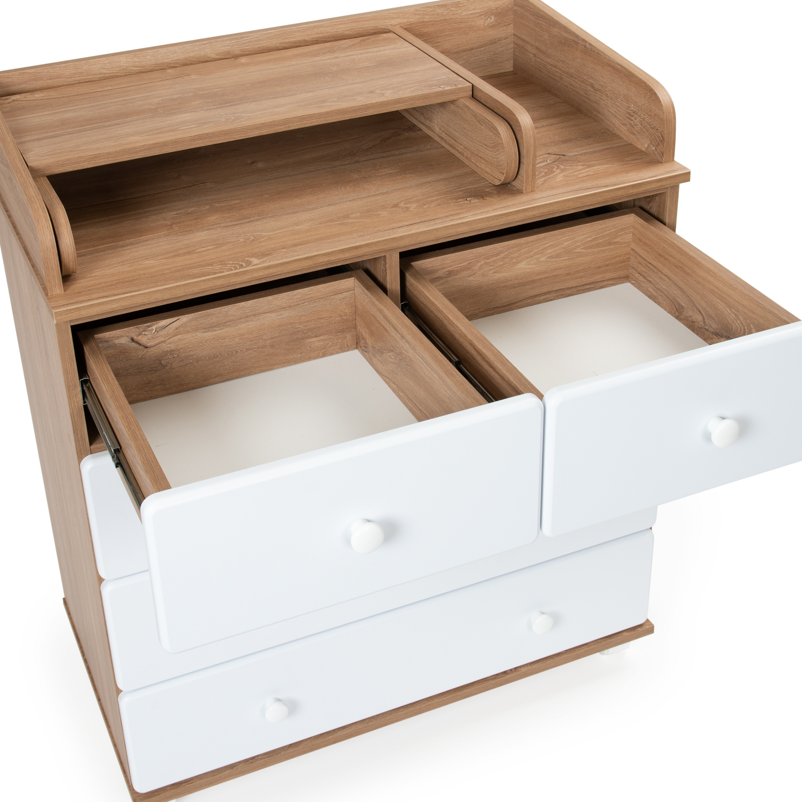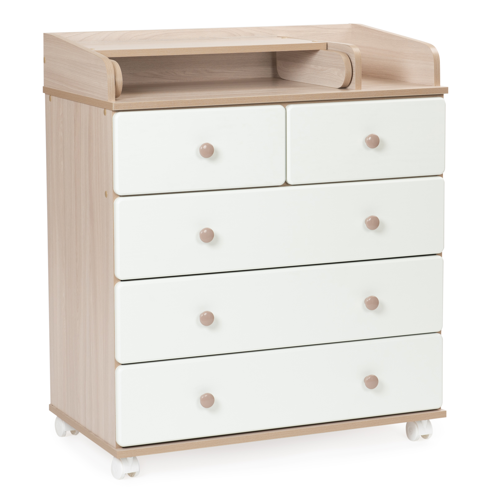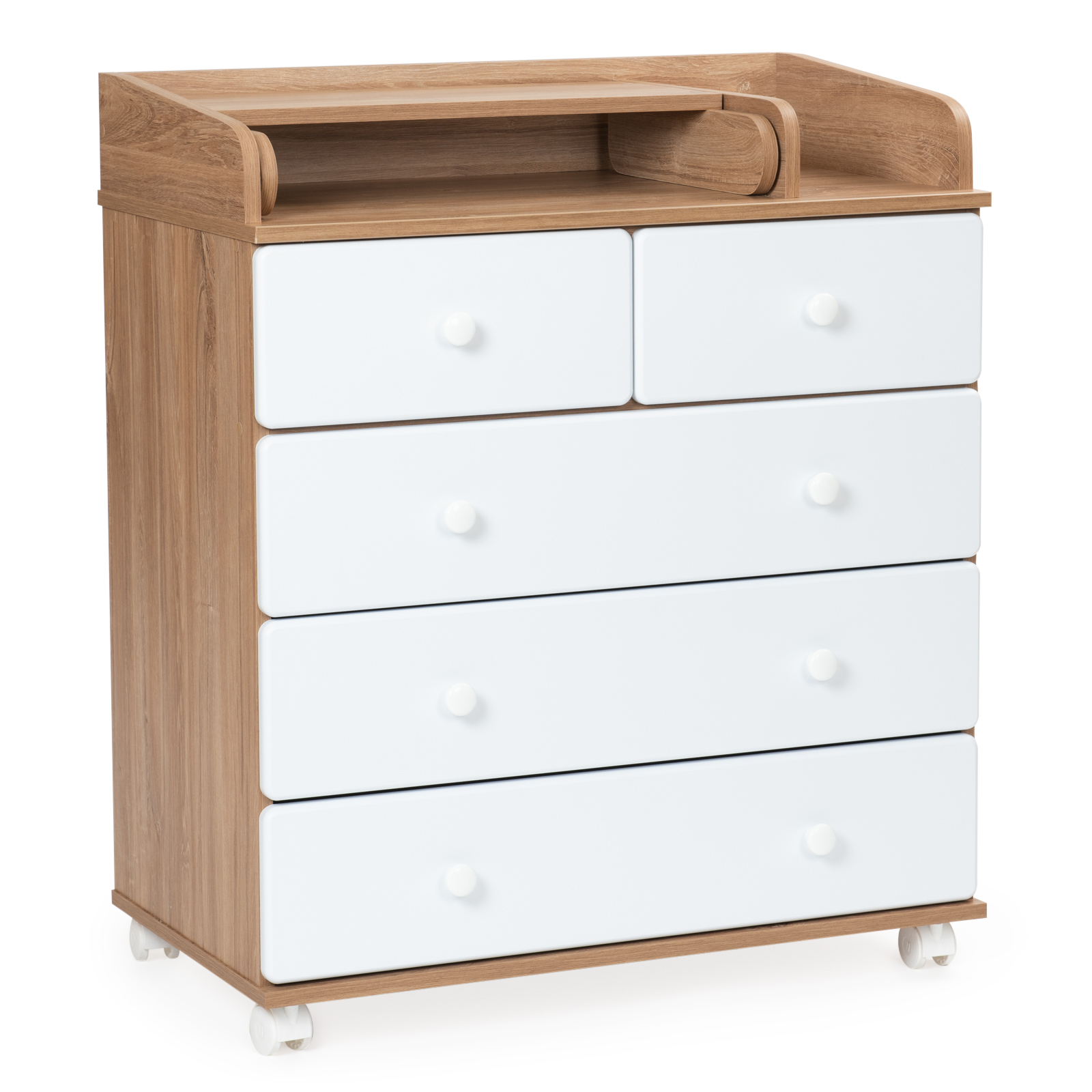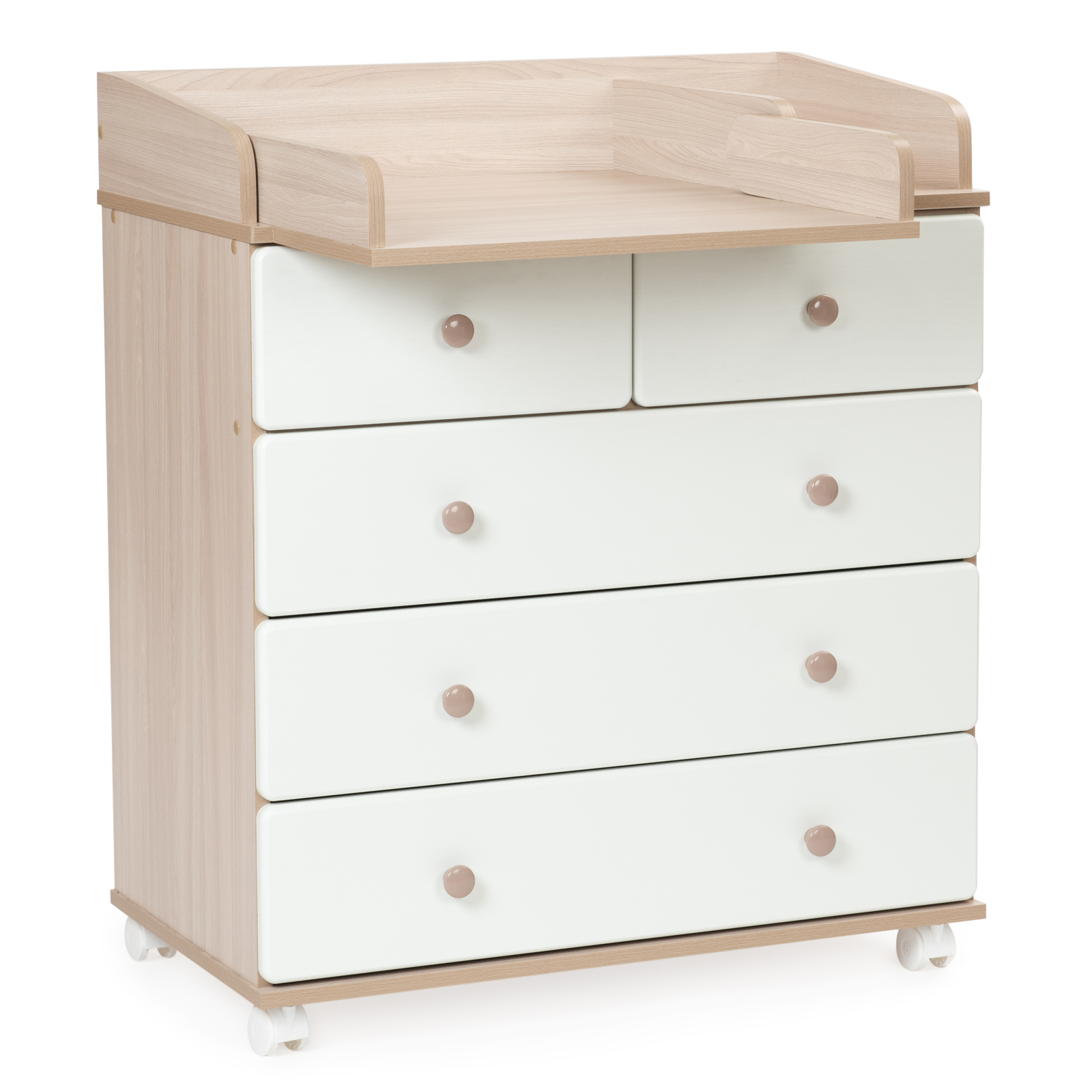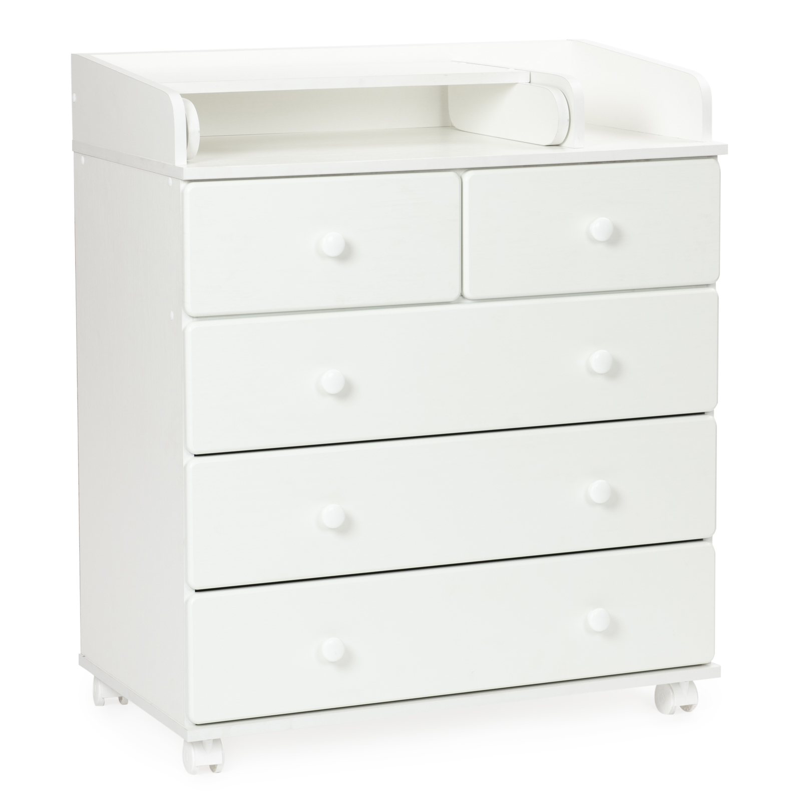 Комод оборудован пеленальным столиком с простым и надежным механизмом раскладывания, 5 вместительных ящика и 4-е колёса со стопором.
