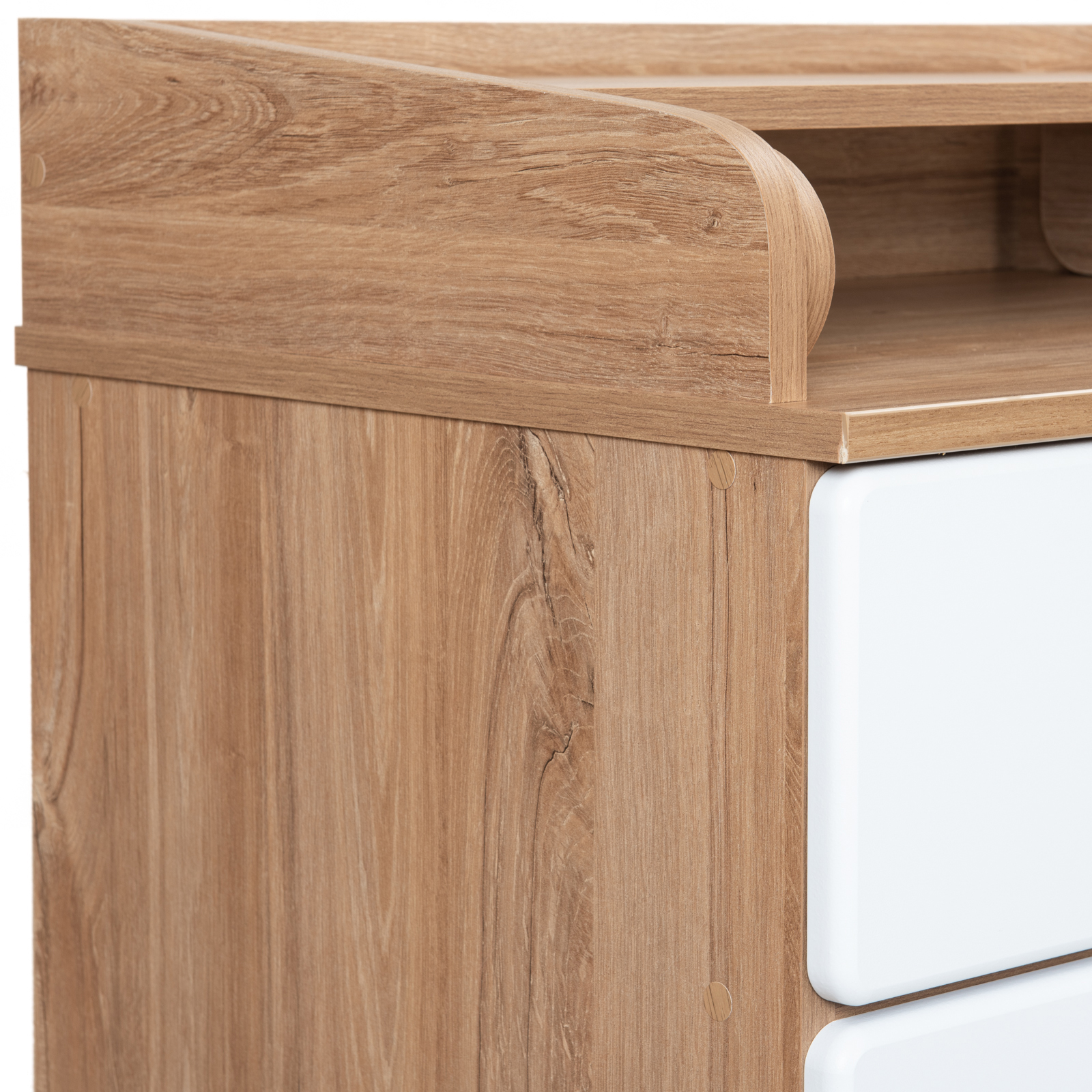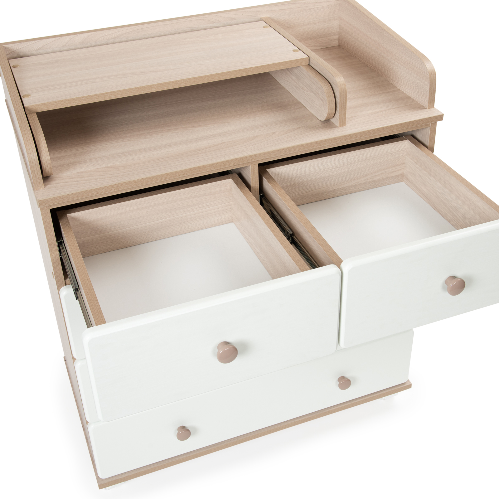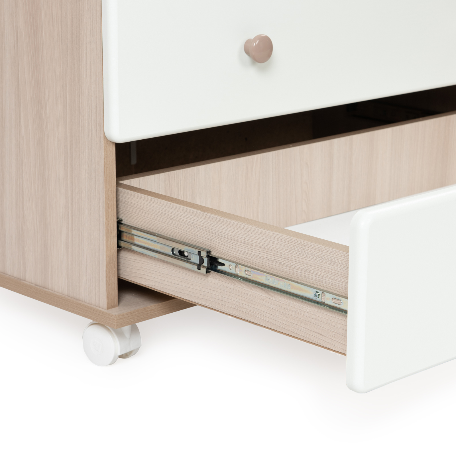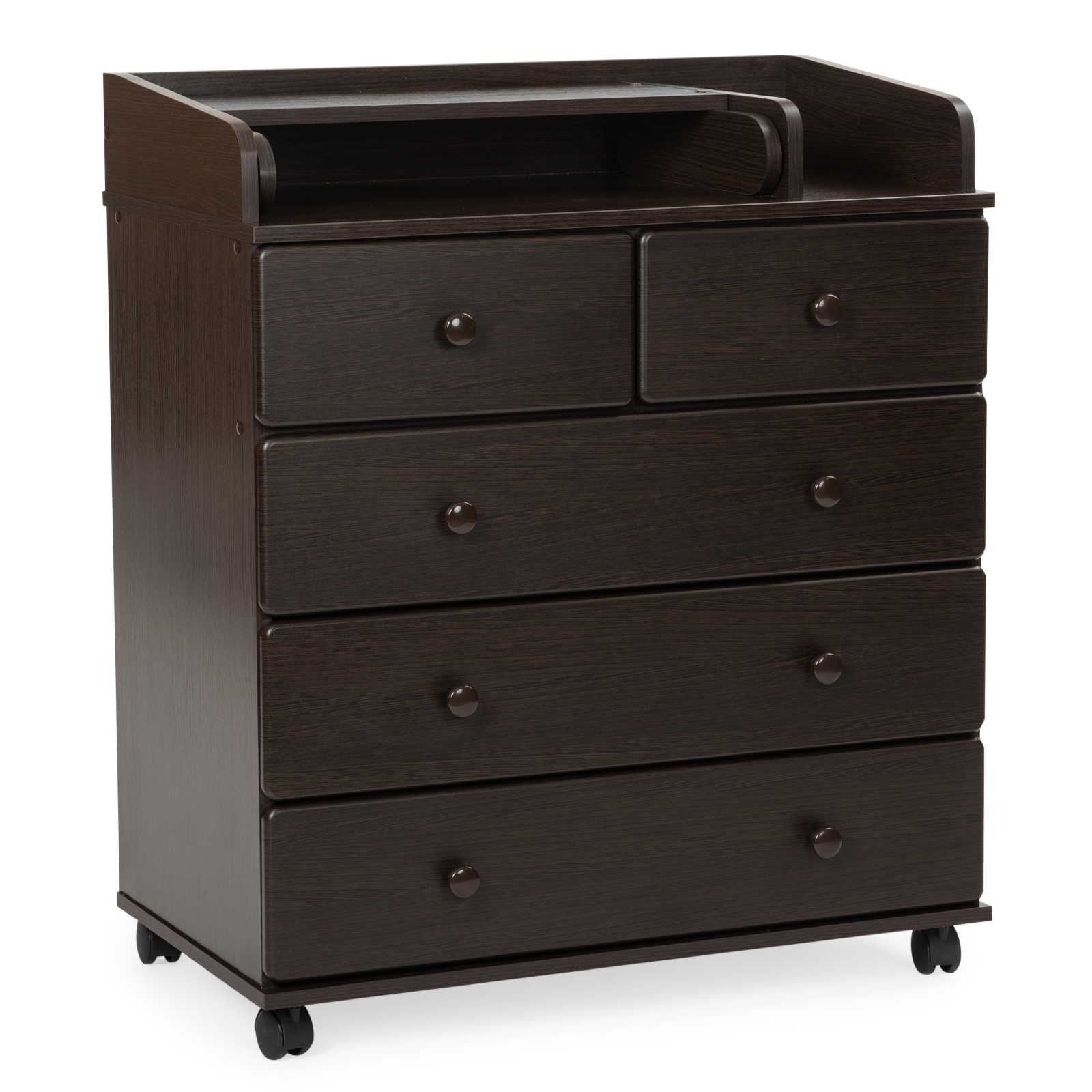 Комод оборудован пеленальным столиком с простым и надежным механизмом раскладывания, 5 вместительных ящика и 4-е колёса со стопором.