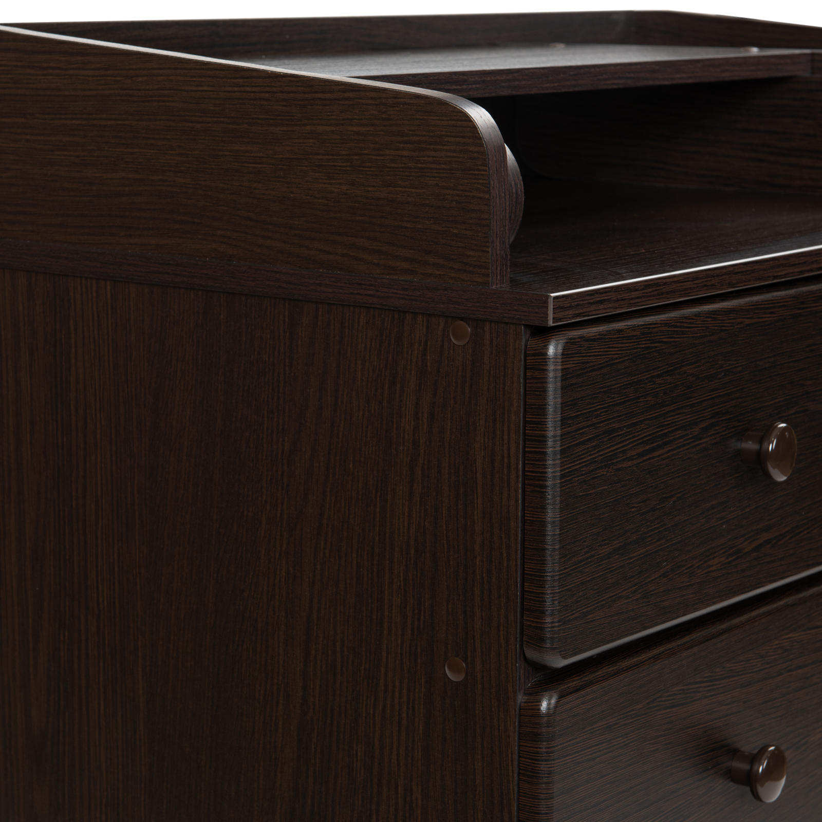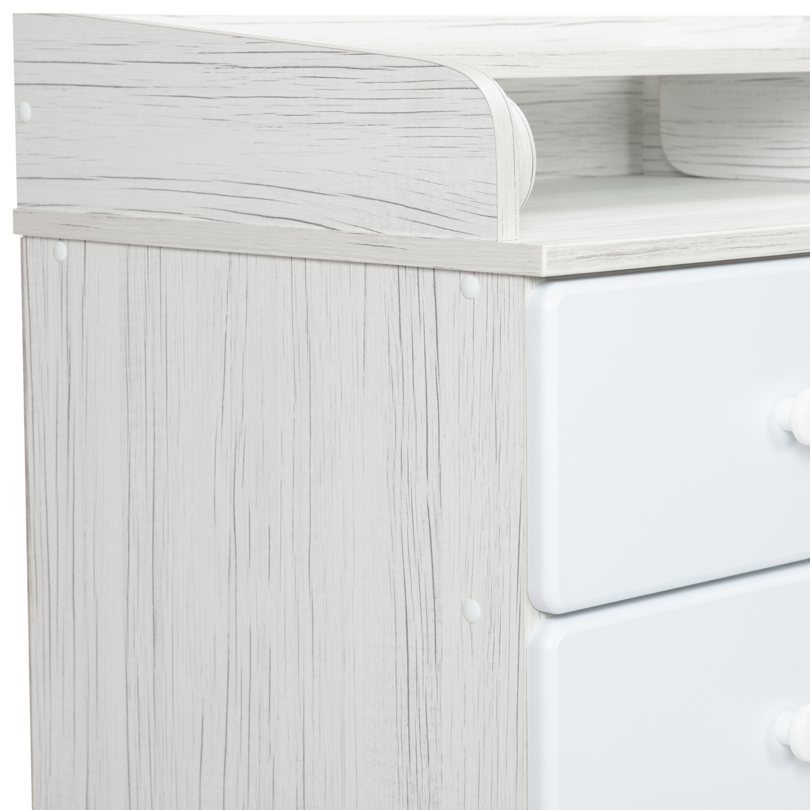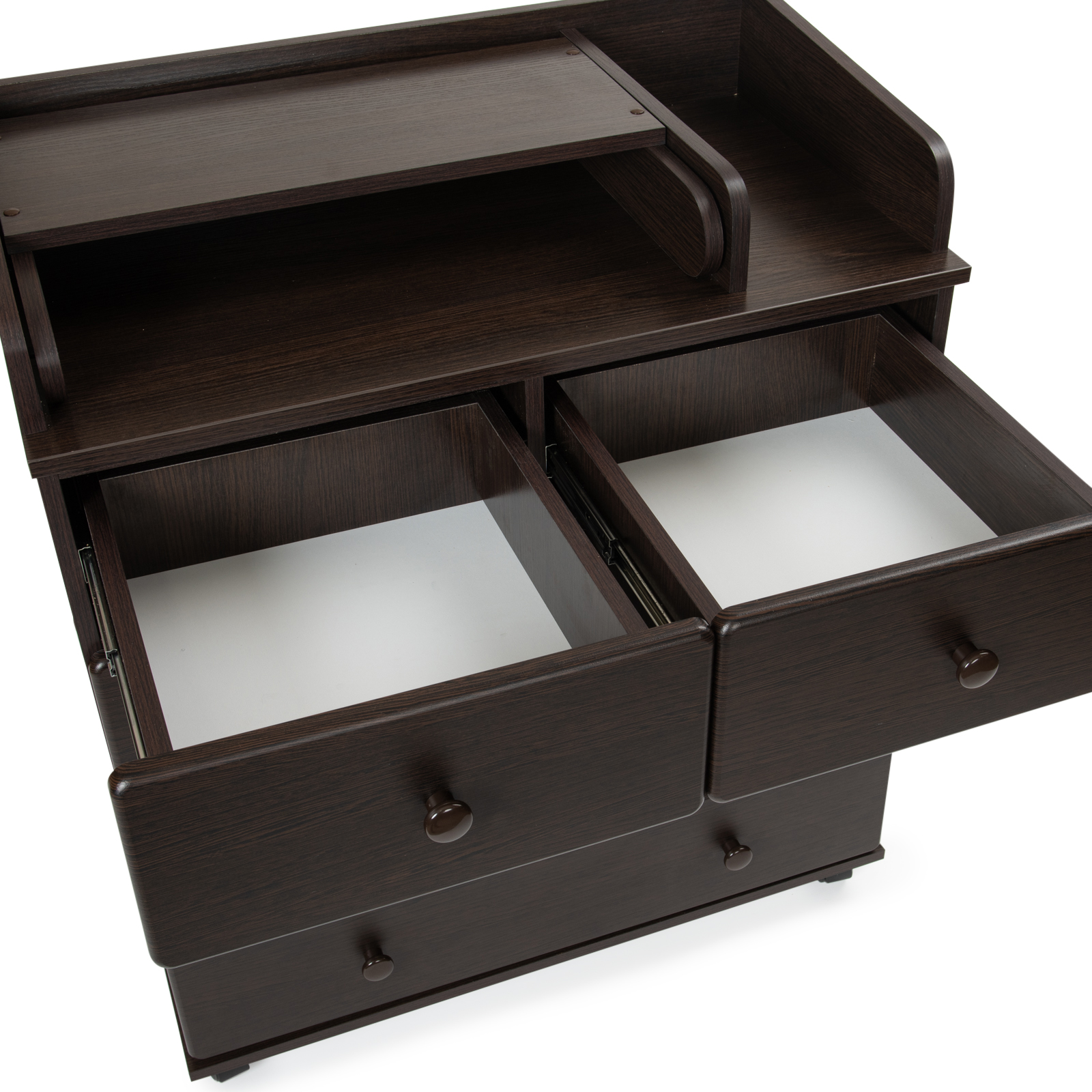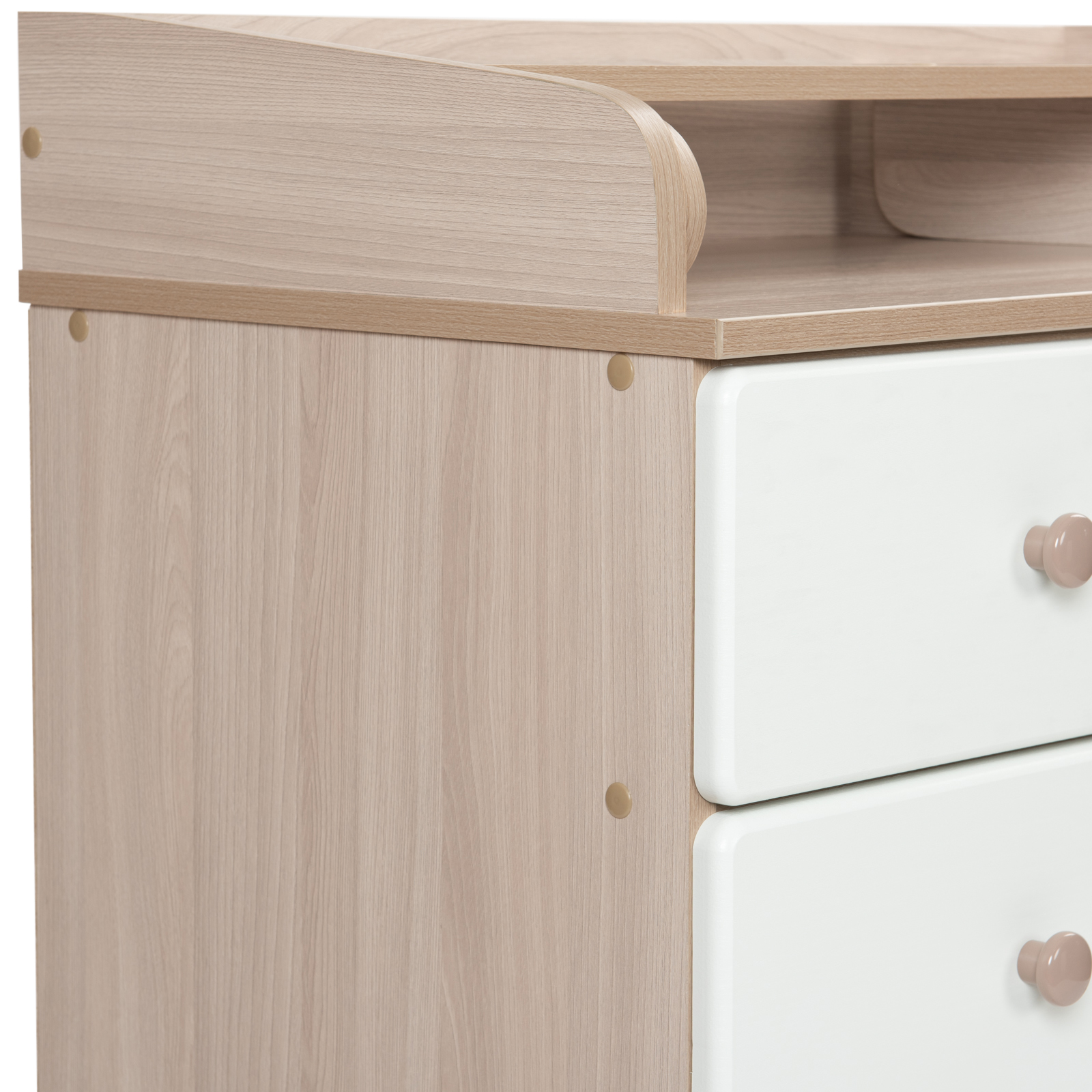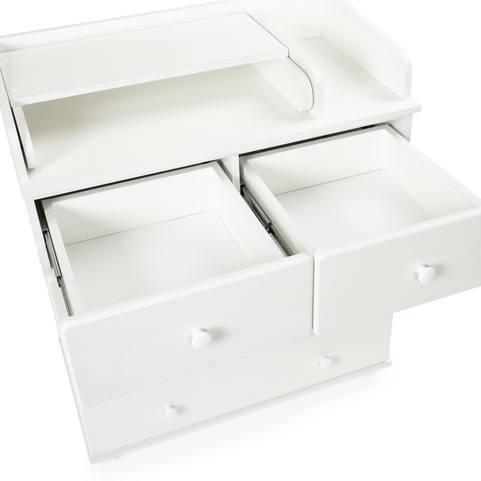 Комод оборудован пеленальным столиком с простым и надежным механизмом раскладывания, 5 вместительных ящика и 4-е колёса со стопором.