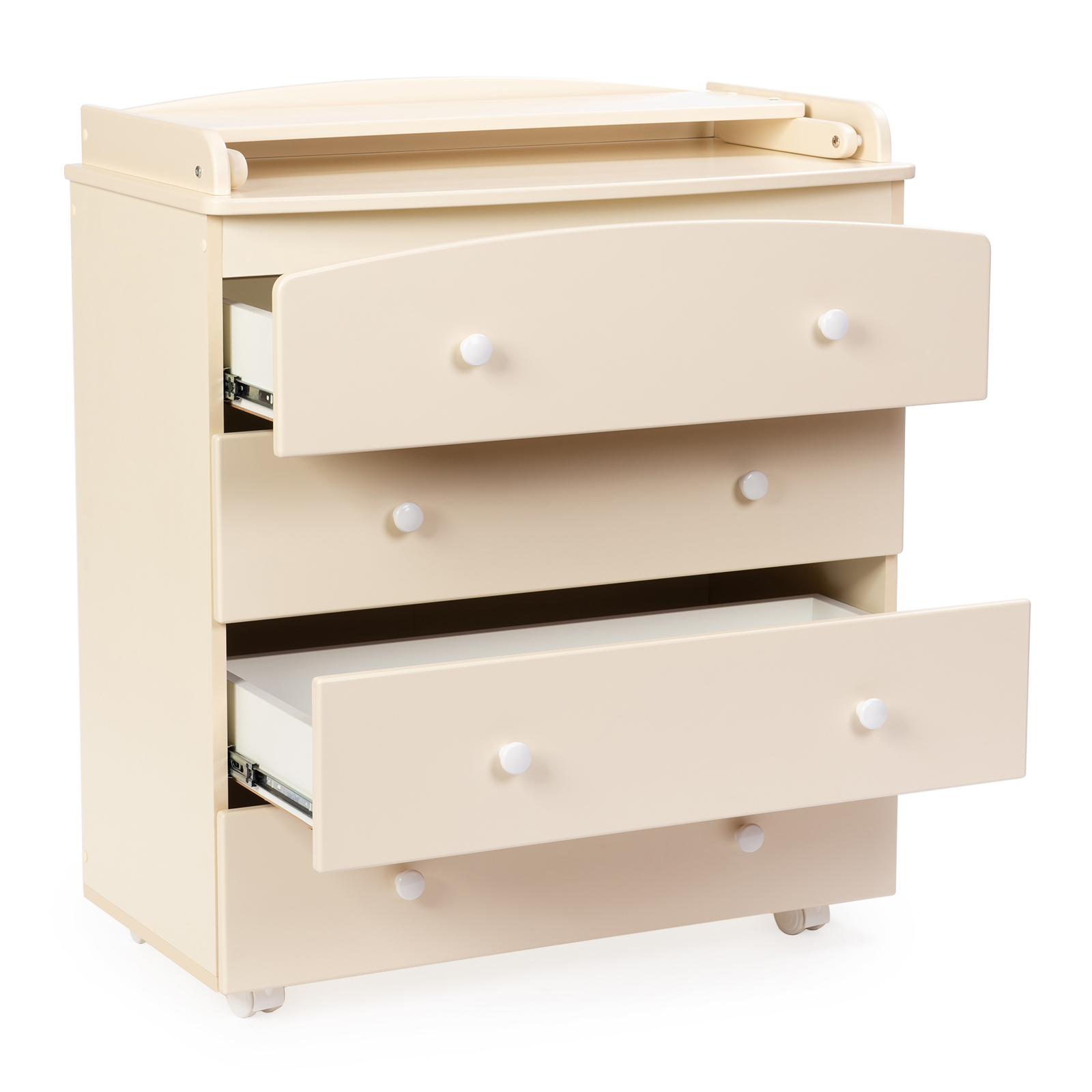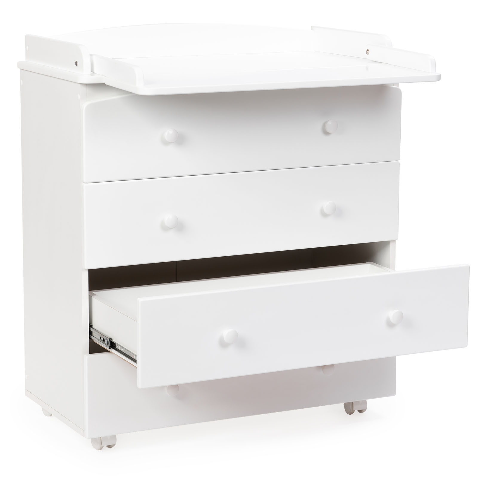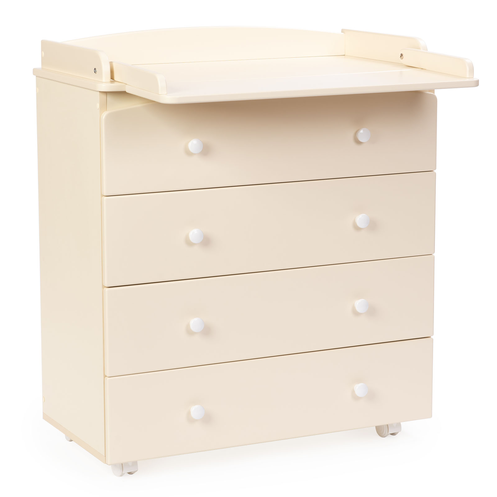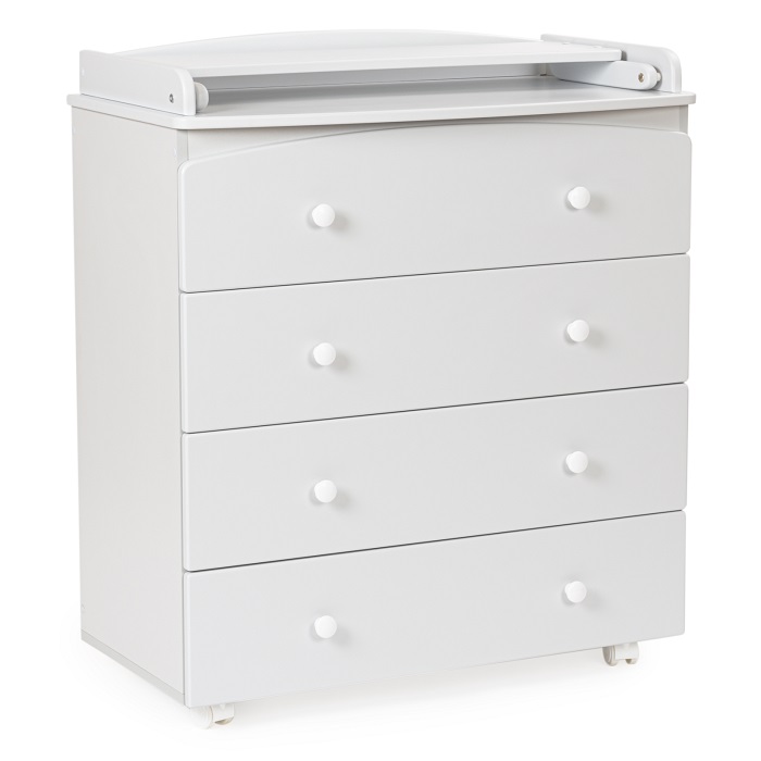 Пеленальный комод BEBIZARO REGENCY FOUR (Бебизаро редженси фо) - качественный комод с пеленальной поверхностью и надежными направляющими, который пригодится вам на долгие годы. Комод выполнен в классическом стиле с удобными ручками. У комода 4 вместительных ящика, бесшумно и плавно открывающихся/закрывающихся. Пеленальный столик складной, что позволит при необходимости раскладывать пеленальную поверхность, а в дальнейшем ее легко сложить и использовать как дополнительные полочки. Пеленальный столик имеет высокие бортики безопасности. Для удобства транспортировки комод оснащен колесами.