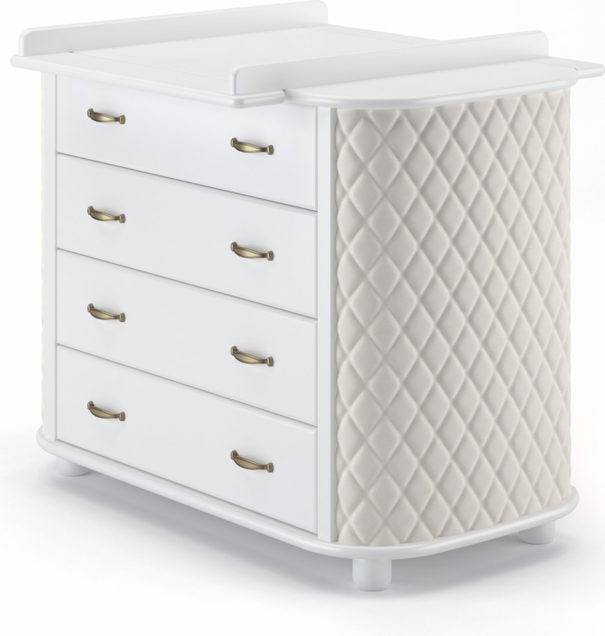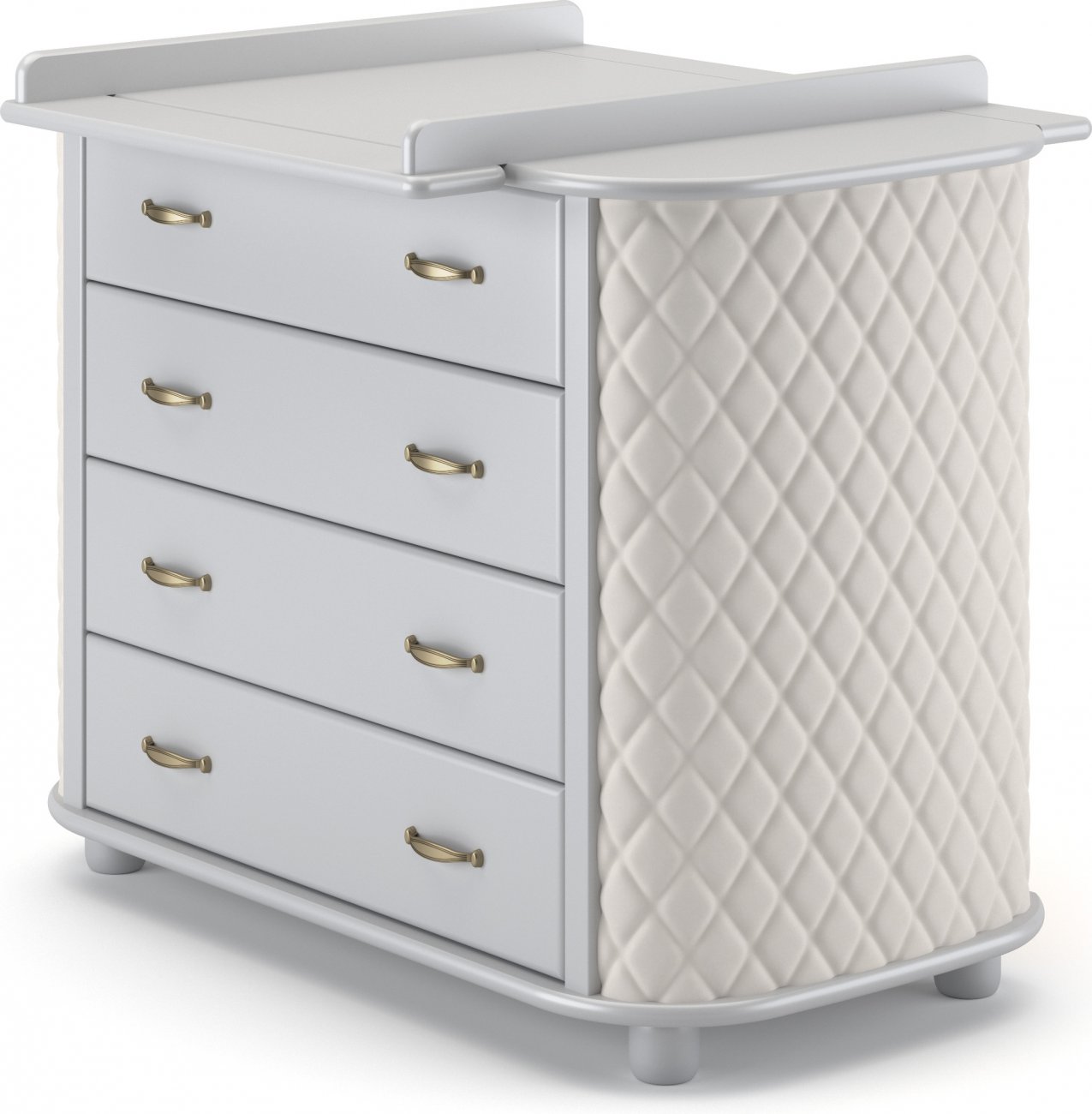 Детский комод Гандылян Тиффани декор Ромб - комод для хранения детских вещей, украшенный мягкой обивкой со стразами. Такой комод не только поможет маме удобно хранить вещи ребенка, но и украсит любую детскую комнату. На комоде расположен съемный пеленальный столик, который поможет ухаживать и переодевать малыша на удобной для родителей высоте.