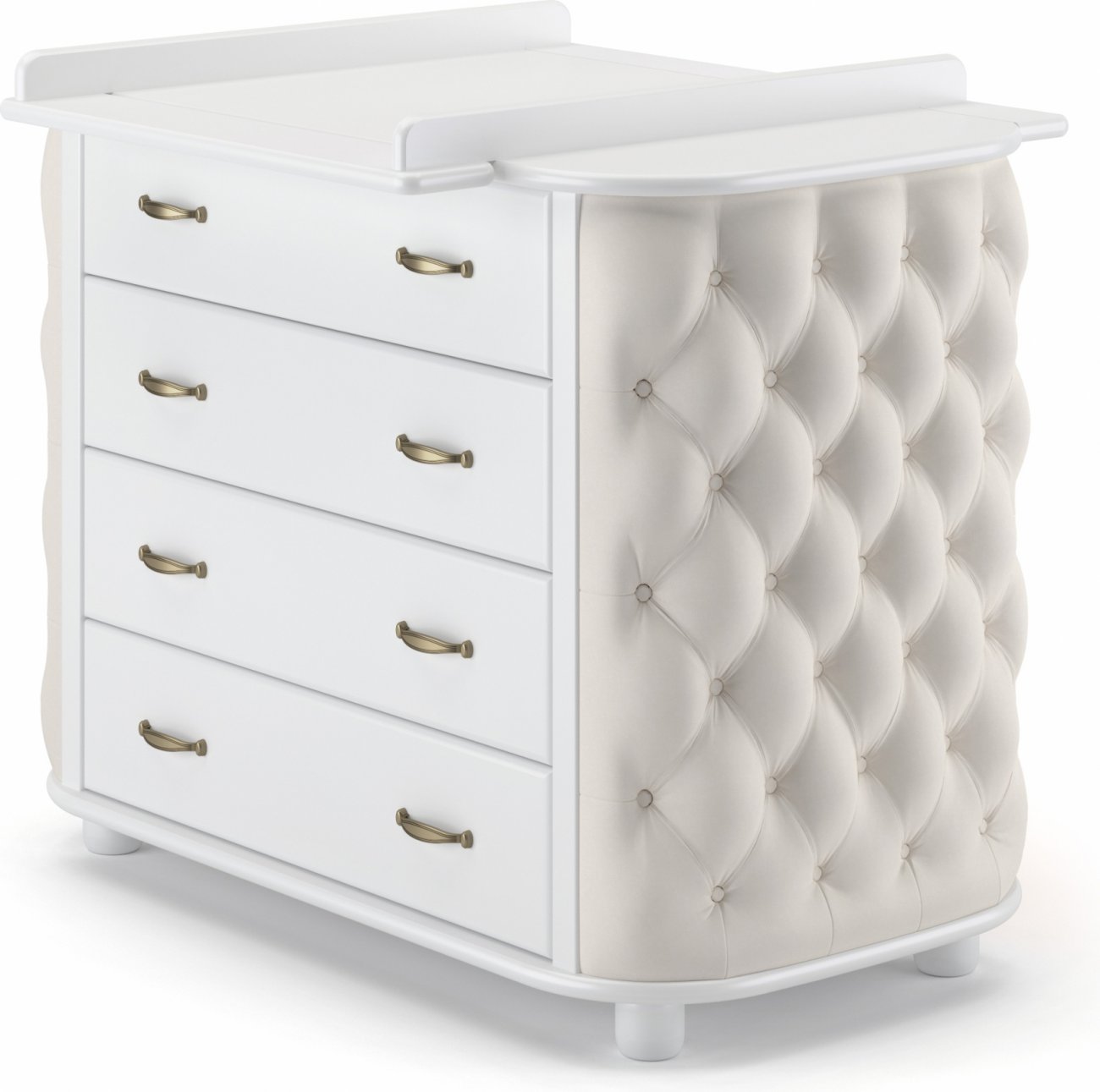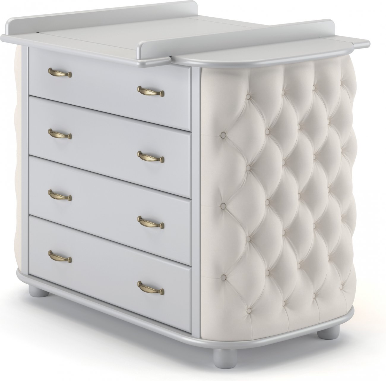Детский комод Гандылян Тиффани декор пуговицы - комод для хранения детских вещей, украшенный мягкой обивкой со стразами. Такой комод не только поможет маме удобно хранить вещи ребенка, но и украсит любую детскую комнату. На комоде расположен съмный пеленальный столик, который поможет ухаживать и переодевать малыша на удобной для родителей высоте. Сбоку расположена дополнительная полочка.