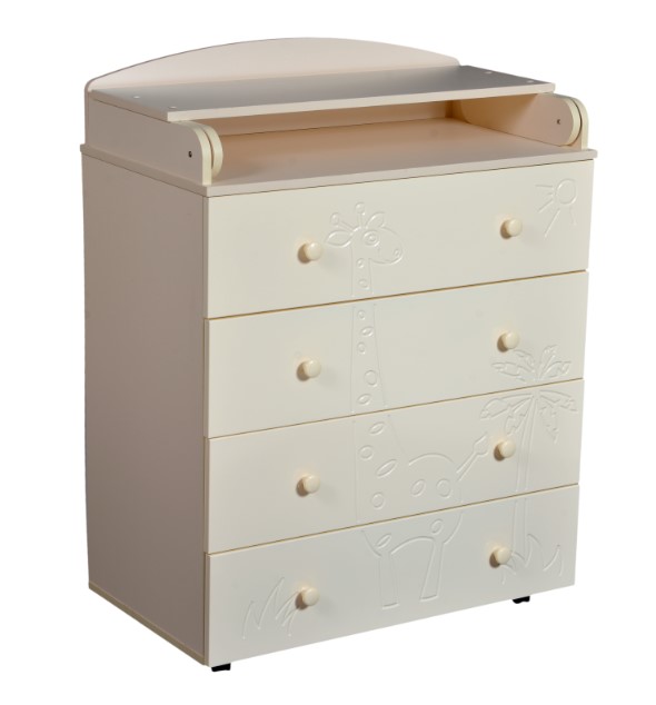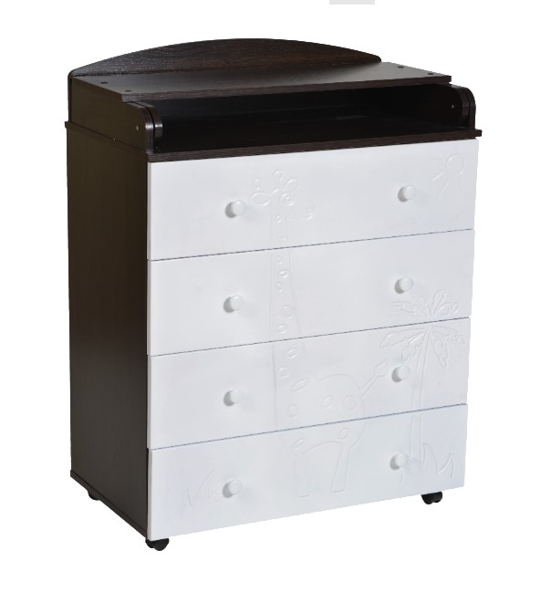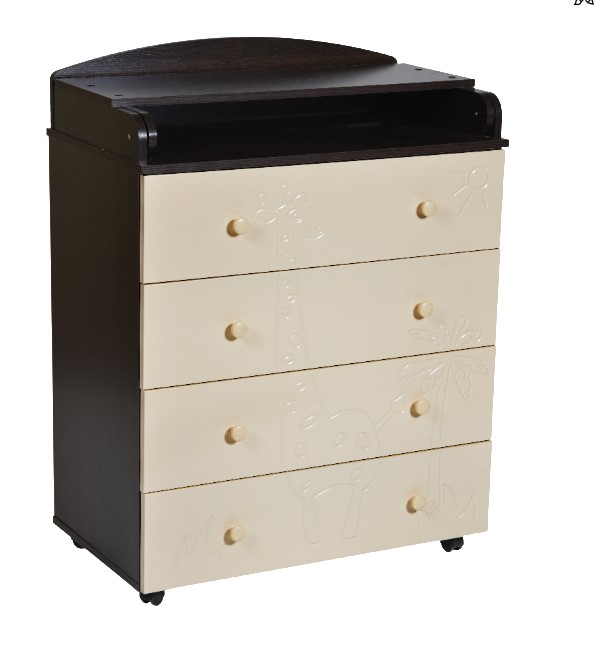 В комоде 4 ящика с бесшумными шариковыми направляющими, удобные ручки, колеса для более простого перемещения по комнате. Украшен детский комод веселым рисунком с жирафиком.