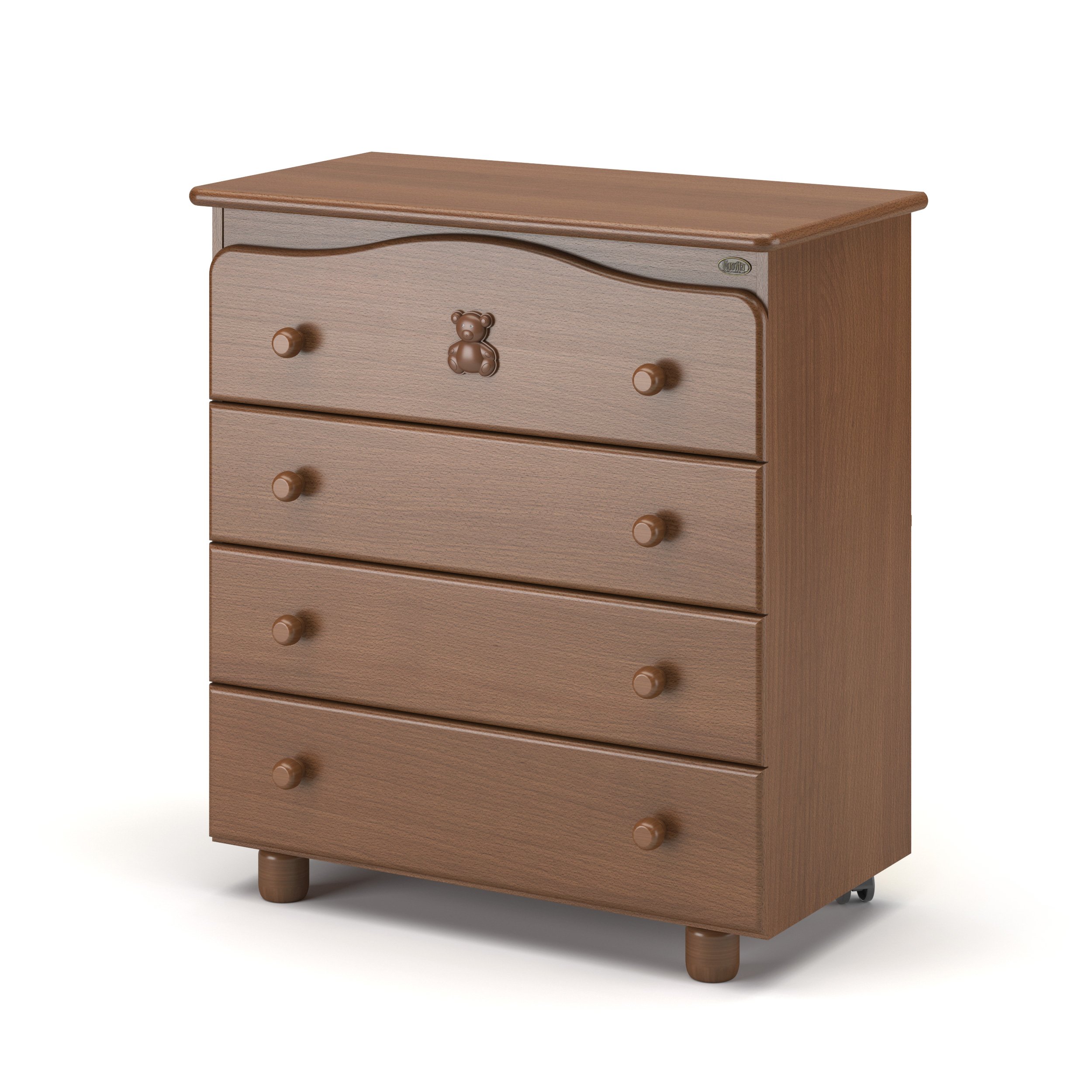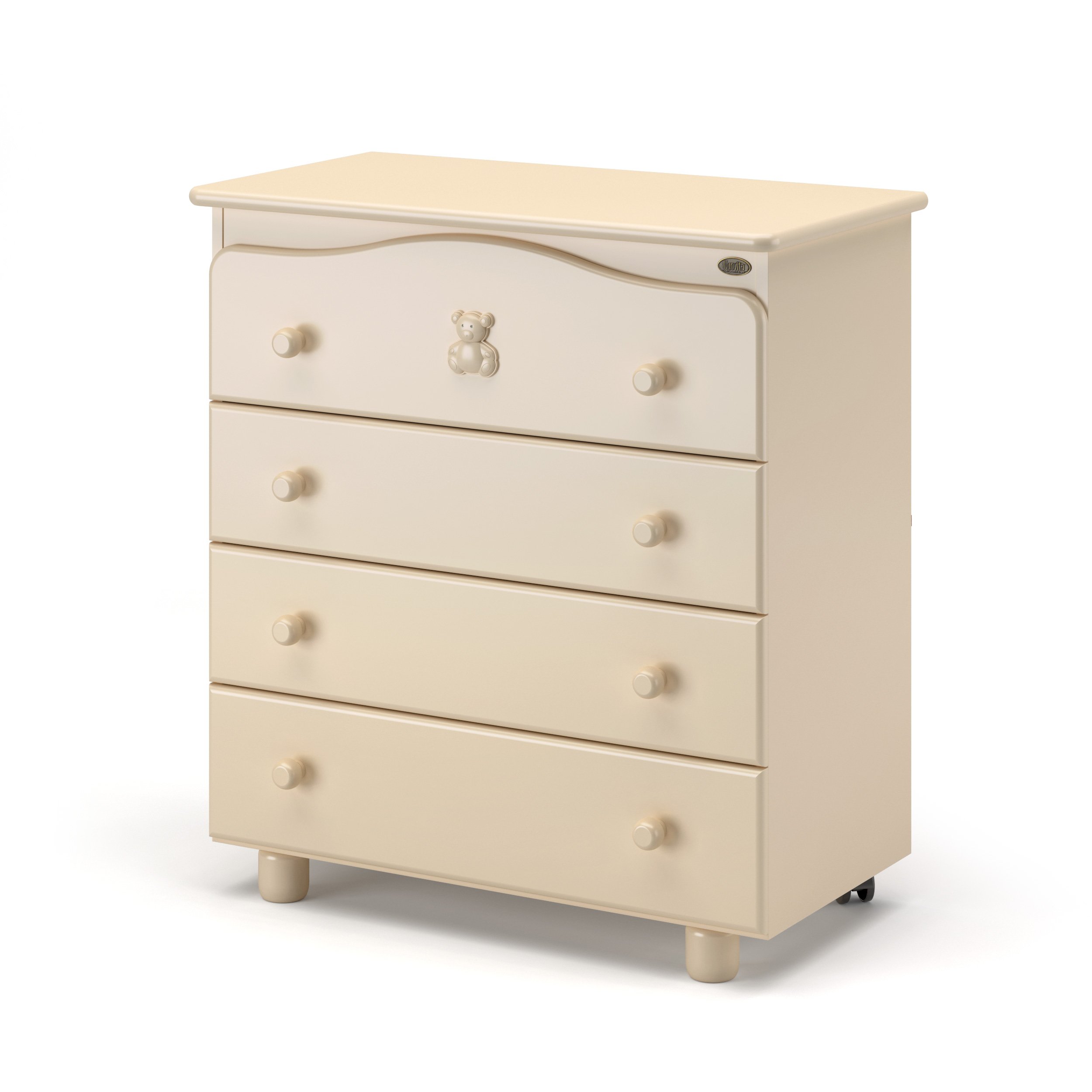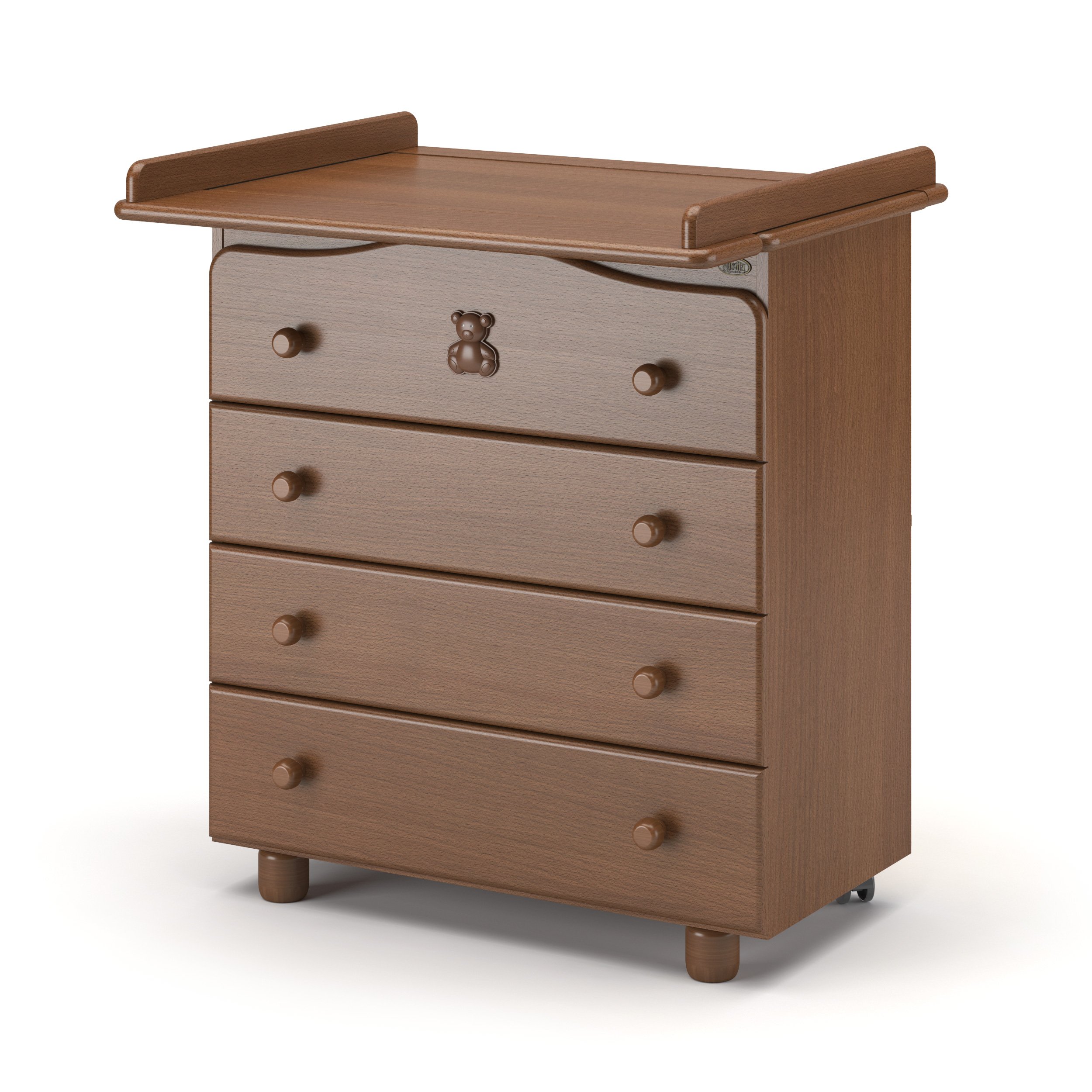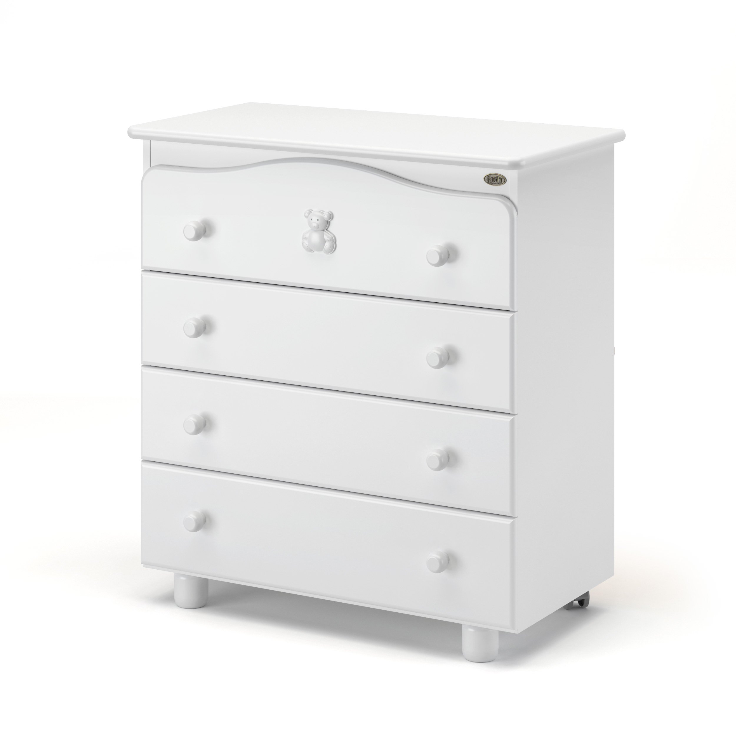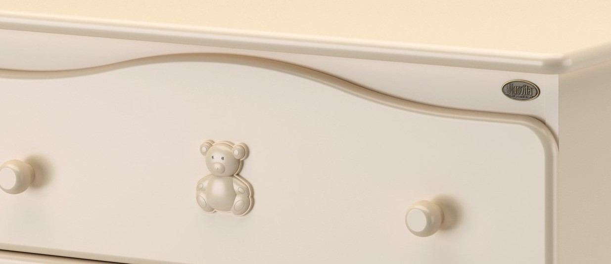 Детский комод с пеленальным столиком Nuovita Fasto (нуовита фасто) - удобный комод из бука с 4-мя вместительными ящиками. Комод оборудован съемным пеленальным столиком, который пригодится маме при уходе за новорожденным. Верхний ящик украшен милым медвежонком со стразами. У комода есть 2 удобных колеса для перемещения по комнате и две надежных устойчивых ножки.