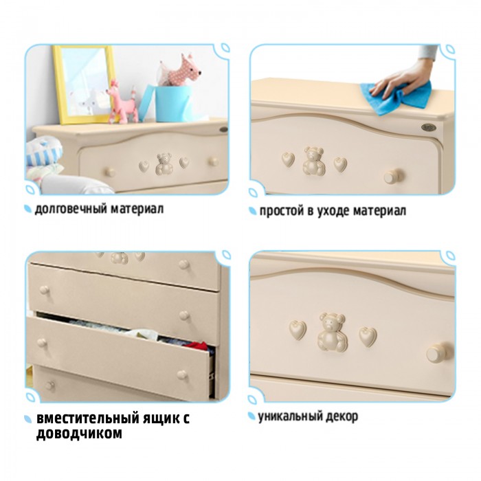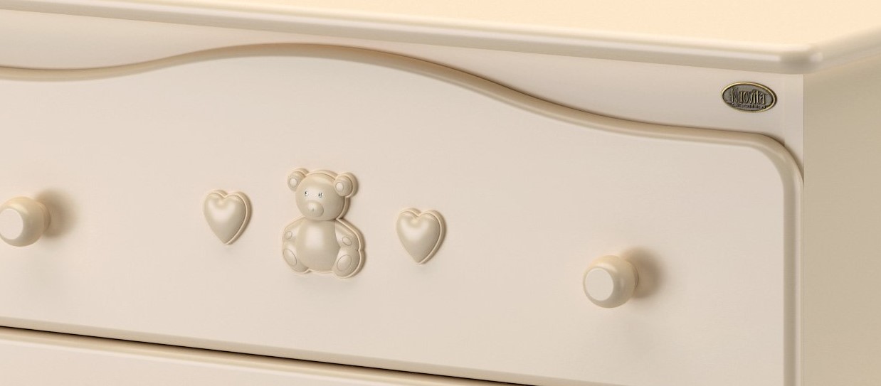 - Красивый рельефный декор на лицевой стороне в виде милого мишки с двумя сердечками по бокам. Форма и декоративное оформление выполнены в едином стиле с кроватками аналогичной серии.
