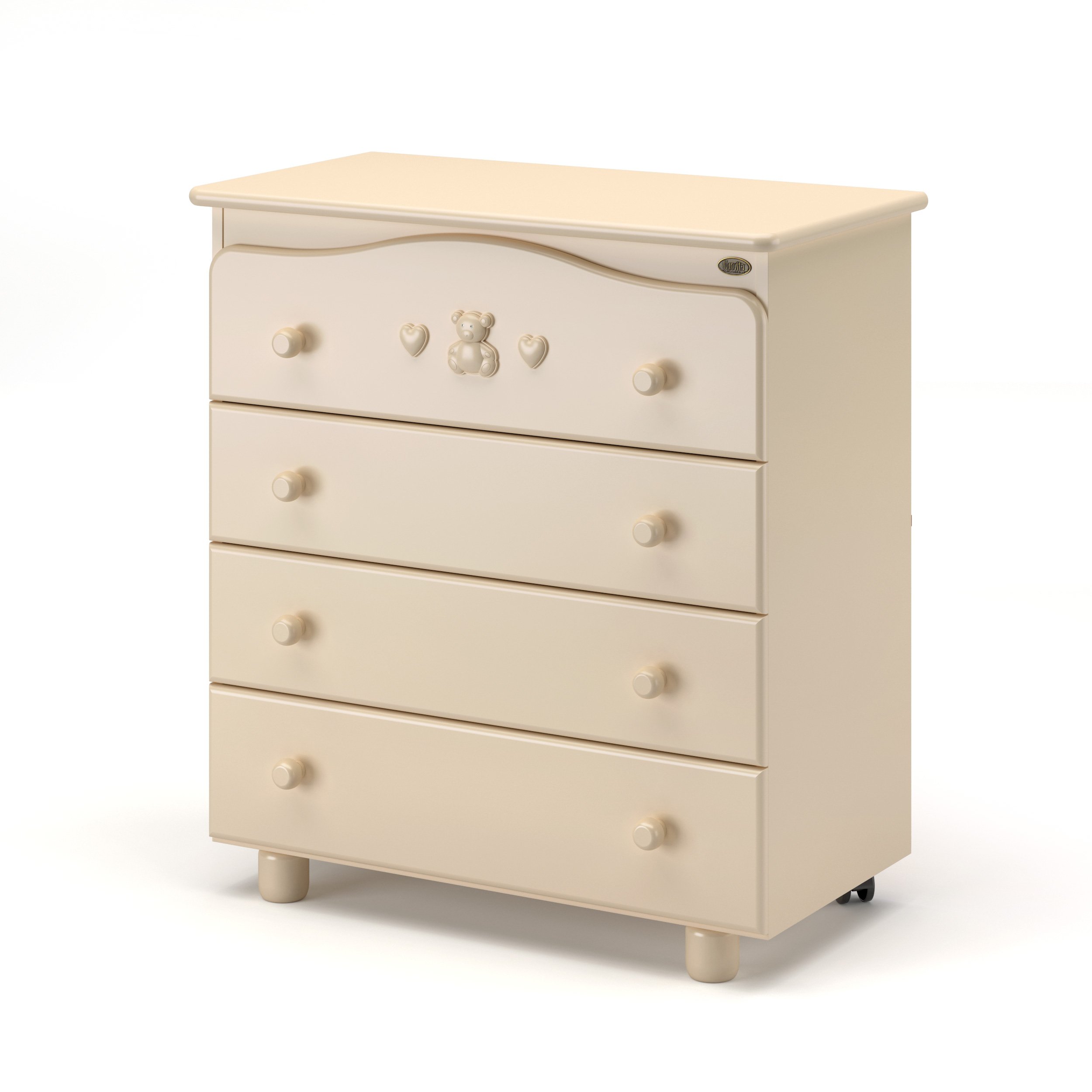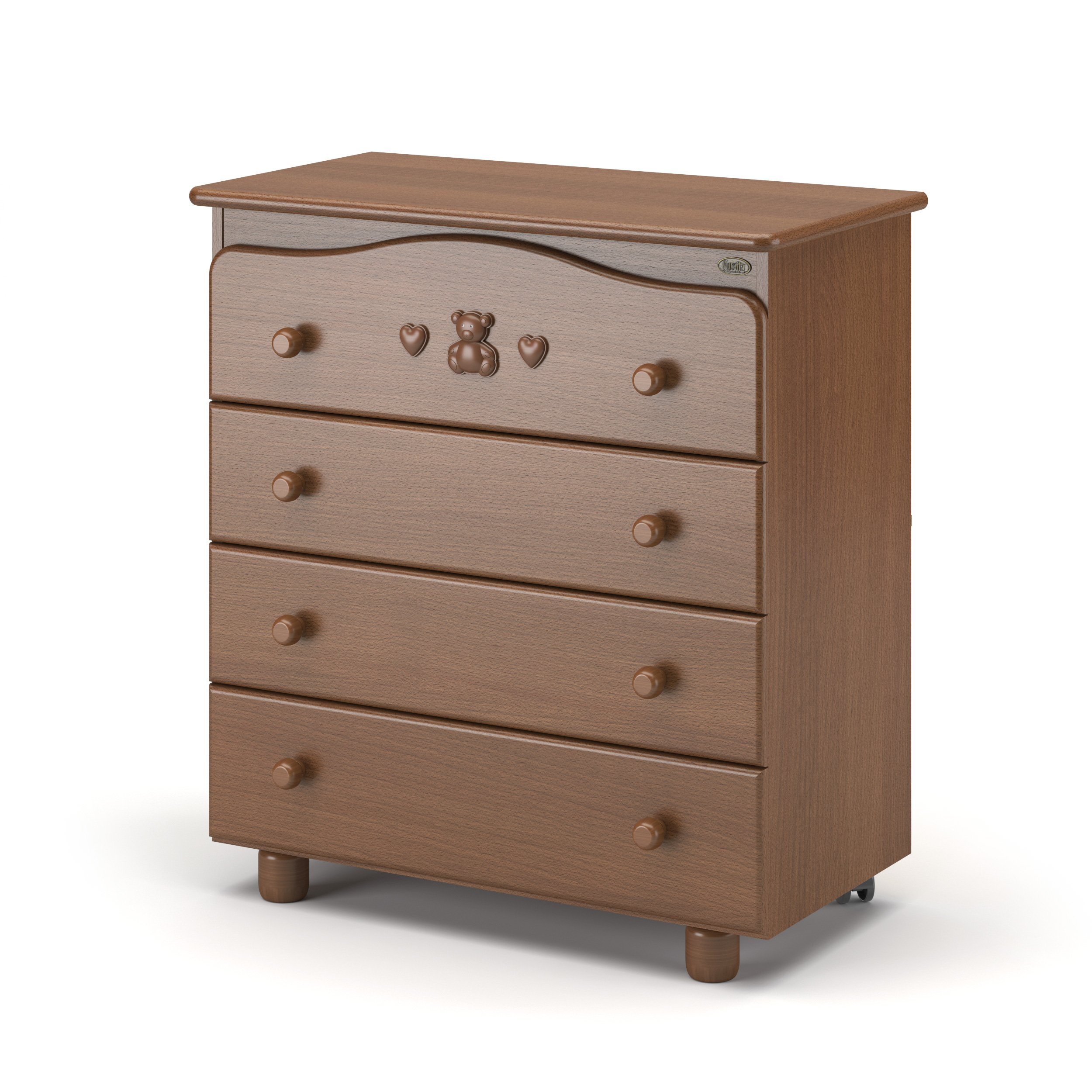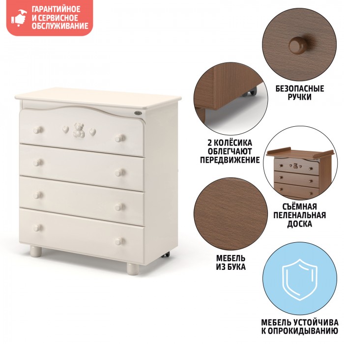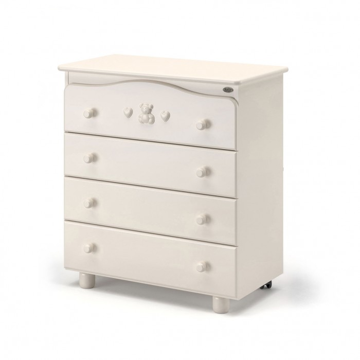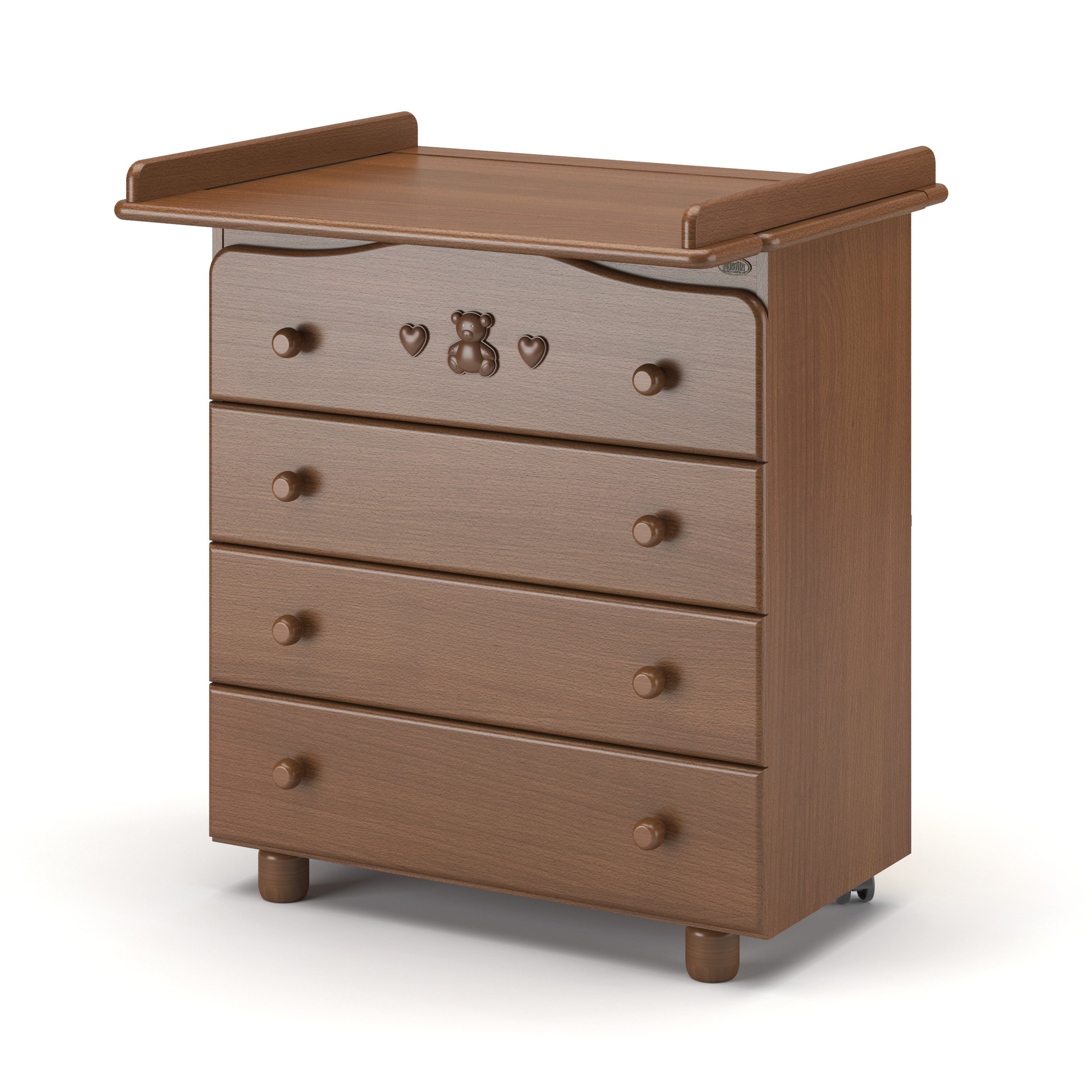 Комод Nuovita Lusso (нуовита луссо) - качественный, устойчивый комод со съемной пеленальной поверхностью. Комод выполнен из экологической, натуральной древесины - бука, что гарантирует долговечность и безопасной комода. Пеленальной поверхность легко устанавливается и снимается с комода, не портя его поверхность, что позволит в дальнейшем использовать комод как бельевой. 4 вместительных ящика оснащены доводчиками, поэтому открытие ящиков будет плавным и бесшумным. Комод оснащен ножками и 2 колесами для перемещения по комнате.