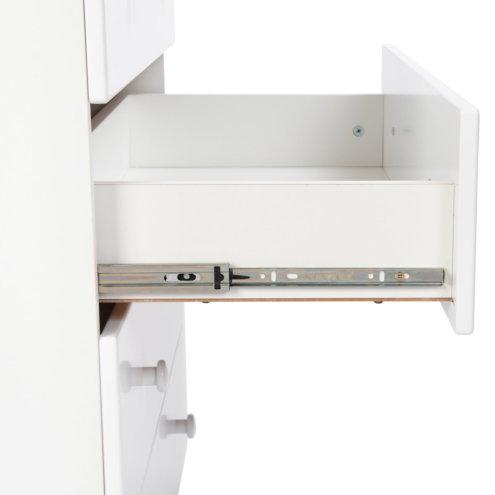 Комод оснащен большими вместительными ящиками с удобными ручками. Шариковые направляющие обеспечат бесшумное выдвижение ящиков и позволят выдержать большую нагрузку на ящики.