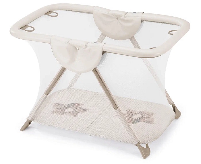 Детский манеж от производителя имеет прямоугольную форму, прочное и надёжное дно, оснащён защитной сеткой, четырьмя ручками и крепкой складной конструкцией, выдерживающей вес до 24 кг. Для большей безопасности снабжён тремя парами защитных упоров, предотвращая манеж от смещения центра тяжести и последующего переворачивания, защищая ребёнка от падений.