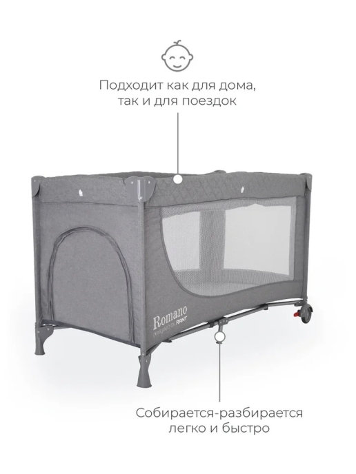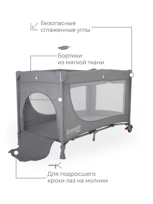 Так же RANT ROMANO надежный, безопасный манеж для самостоятельных игр ребенка. Благодаря сетчатым вставкам вам будет хорошо видно ребенка, а ребенку вас. Так же сетчатые вставки обеспечат хорошую вентиляцию внутри манежа (кроватки). Все углы закрыты специальными пластиковыми накладками. Материал манежа крепкий и абсолютно безопасный для ребенка.