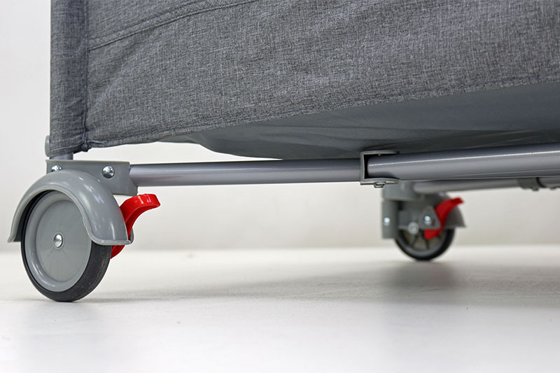 Манеж оснащен устойчивыми ножками и колеса со стопорами, для облегчения перемещения манежа.