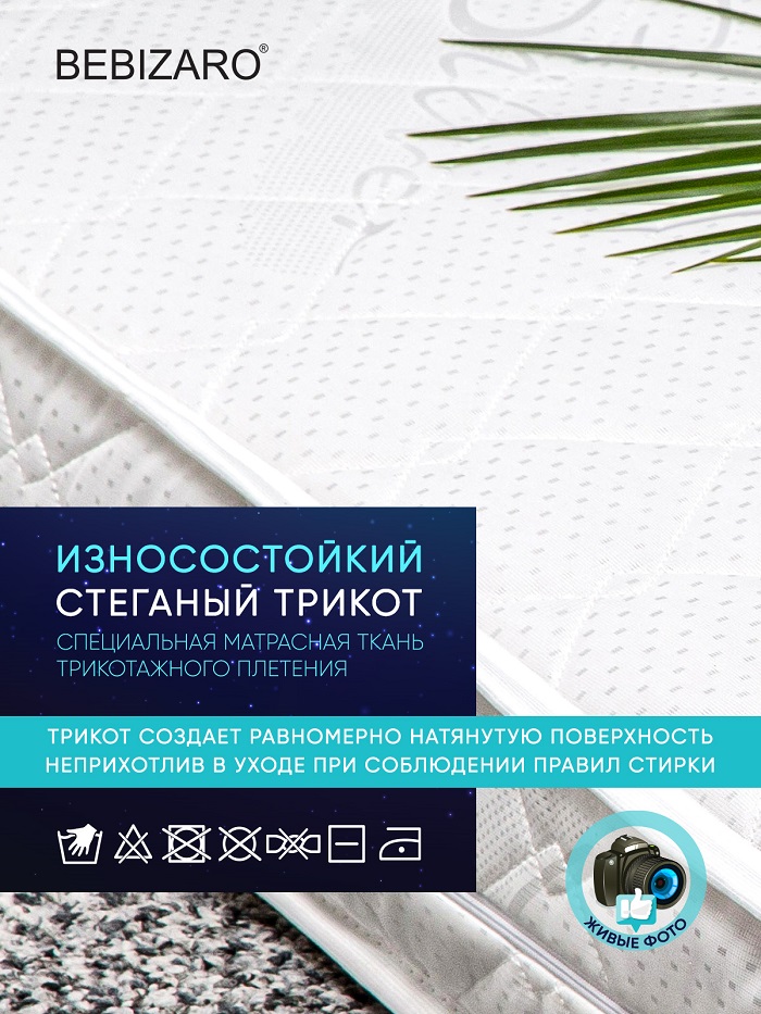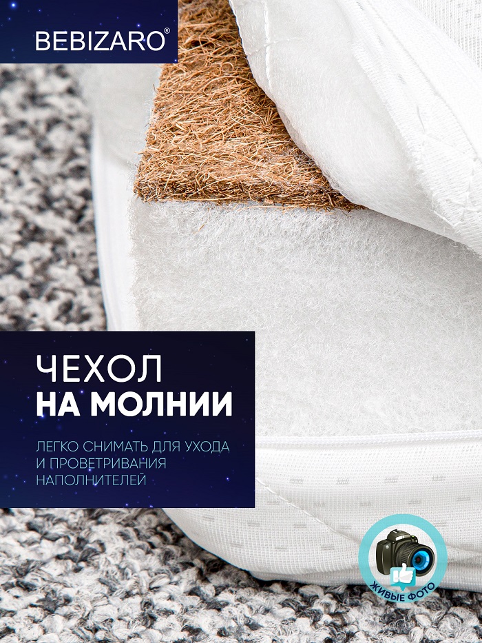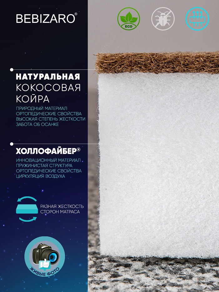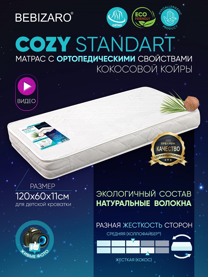 Детский матрас BEBIZARO COZY STANDART 120х60 см (Бебизаро кози стандарт) - Ортопедический матрас - имеет две стороны разной жесткости, обеспечивает здоровый и комфортный сон детей. Подходит для кровати со спальным местом 120х60 см. Двусторонний матрас решает сразу две задачи: одна сторона обеспечивает жесткую поддержку позвоночника с самого рождения, а на второй стороне расположены более эластичные материалы для комфортного сна ребенка.