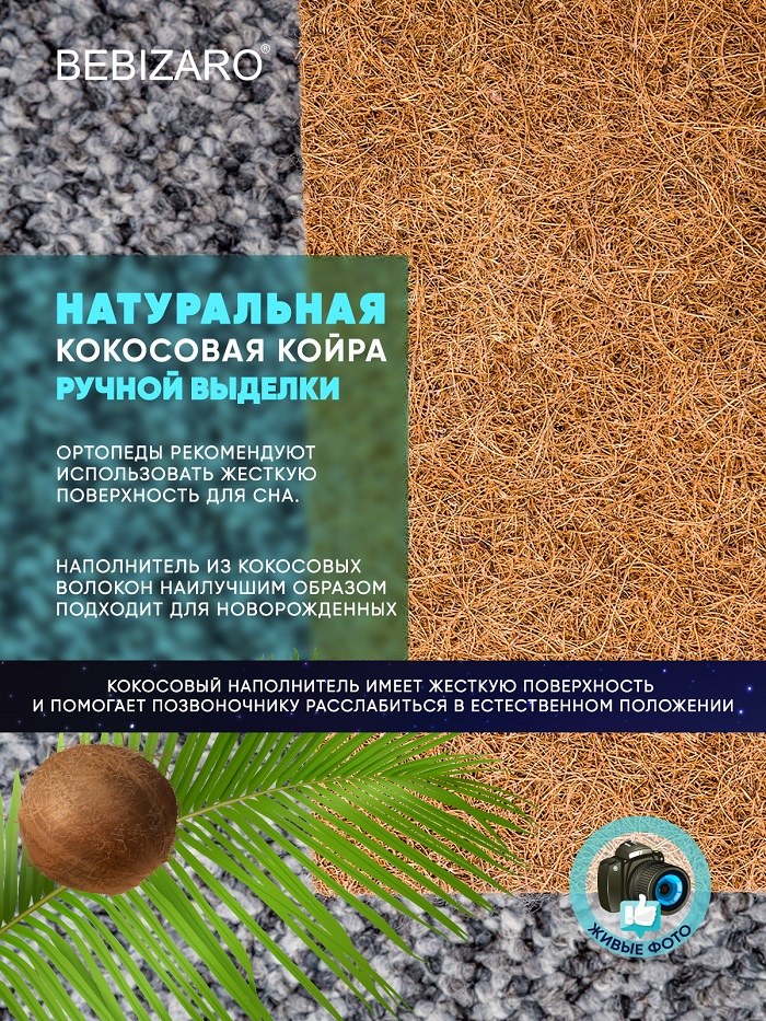 - Материал: Холлофайбер (плита повышенной жесткости), Кокосовая койра, Чехол съемный