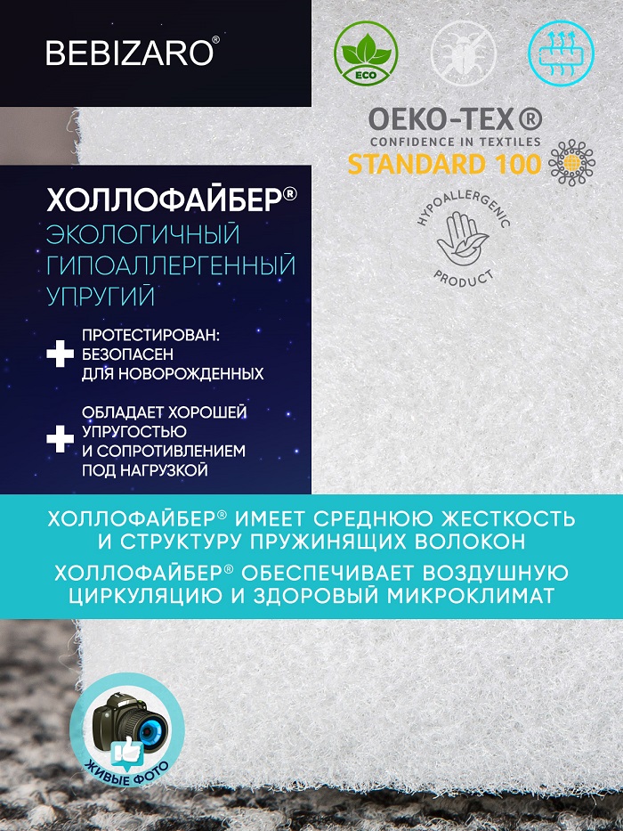 - Двусторонний матрас из инновационных экологических материалов. Основу первой стороны матраса составляет Холлофайбер хард. Материал относится к системе полужестких наполнителей из-за формы волокон — вертикальных спиралек. Именно благодаря им изделие быстро восстанавливает форму и не теряет первоначального вида, сохраняя поверхность упругой. Воздух в таком матрасе отлично циркулирует, лишняя влага не скапливается внутри, что препятствует появлению опасных бактерий и микроорганизмов.