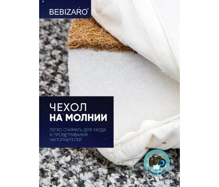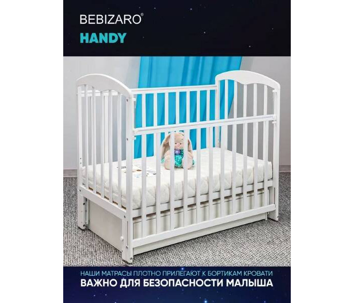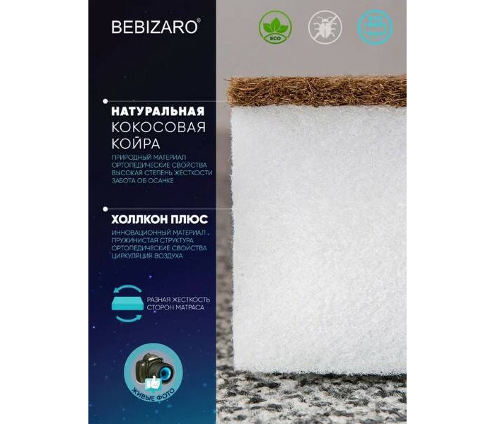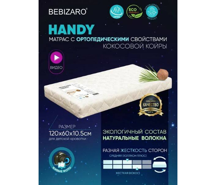 Детский матрас BEBIZARO HANDY 120х60 см (бебизаро хенди) - Ортопедический матрас - имеет две стороны разной жесткости, обеспечивает здоровый и комфортный сон детей от рождения до 3-4 лет. Подходит для кровати со спальным местом 120х60 см. Двусторонний матрас решает сразу две задачи: одна сторона обеспечивает жесткую поддержку позвоночника с самого рождения, а на второй стороне расположены более эластичные материалы для комфортного сна ребенка от 6-ти месяцев.