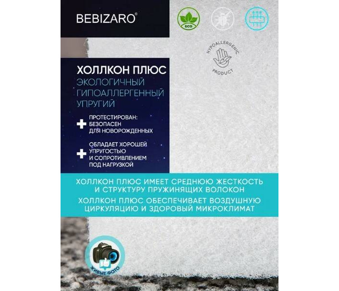 - Hollcon Plus (100 мм) – основной наполнитель матраса. Упругий материал, который хорошо сберегает тепло, не накапливает статического напряжения, не боится влаги, не поддается слеживанию.