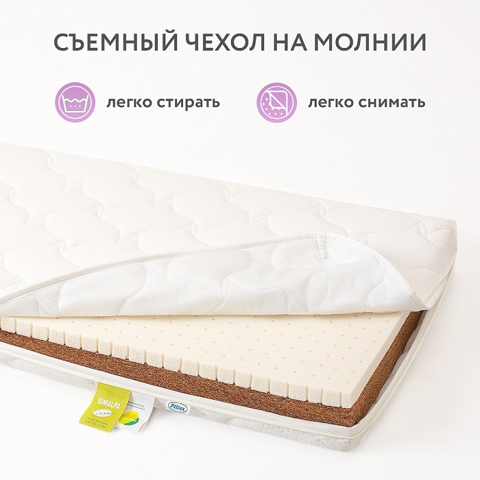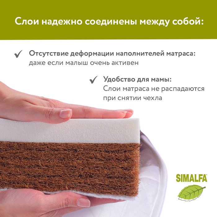 Для удобства слои матраса скреплены между собой. Важно: слои скреплены специальным экологичным составом Simalfa (производство Швейцария). Состав на водной основе, без запаха, безопасен для ребенка и имеет сертификат качества.
