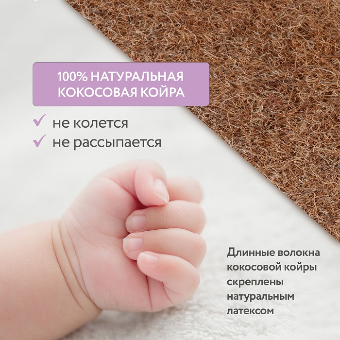 Натуральная кокосовая койра, скрепленная натуральным латексом, признана одним из лучших наполнителей для детских матрасов, кроме того, она очень неприхотлива в уходе. На кокосовую сторону врачи-ортопеды рекомендуют укладывать новорожденных. Жесткая кокосовая койра «отвечает» за то, чтобы формирующийся позвоночник ребенка не прогибался. После года, когда косточки и скелет малыша окрепнут, матрас можно перевернуть на более мягкую сторону из анатомического латекса.