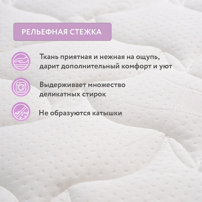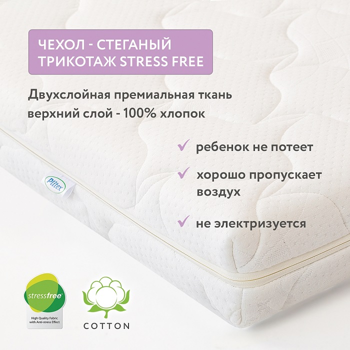 Инновационная ткань Stress Free, из которой сделан чехол матраса, оказывает благоприятное воздействие на сон, поскольку снимает с тела статический заряд, тем самым успокаивая нервную систему. Чехол можно снять для стирки, а наполнители в это время проветрить.