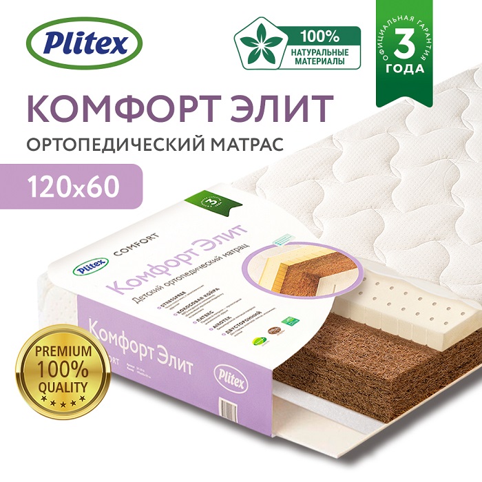 Детский матрас PLITEX Evolution Комфорт-Элит (119х60х9,5см) - двухсторонний ортопедический матрас премиум-класса на основе натуральных наполнителей – кокосовой койры и латекса.