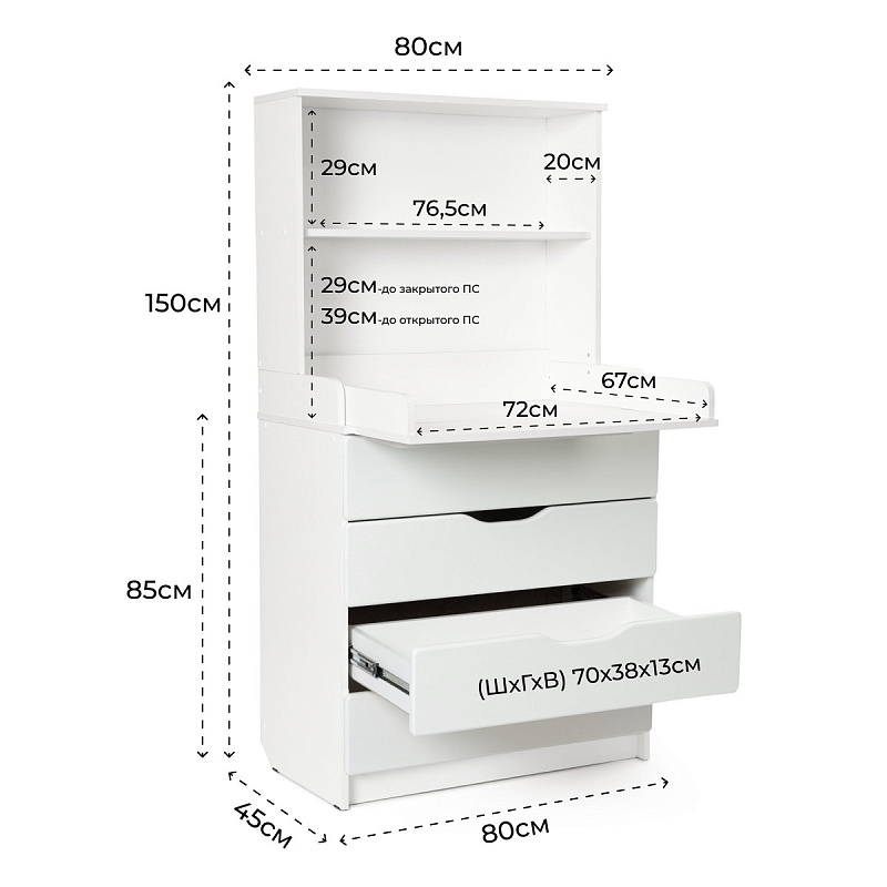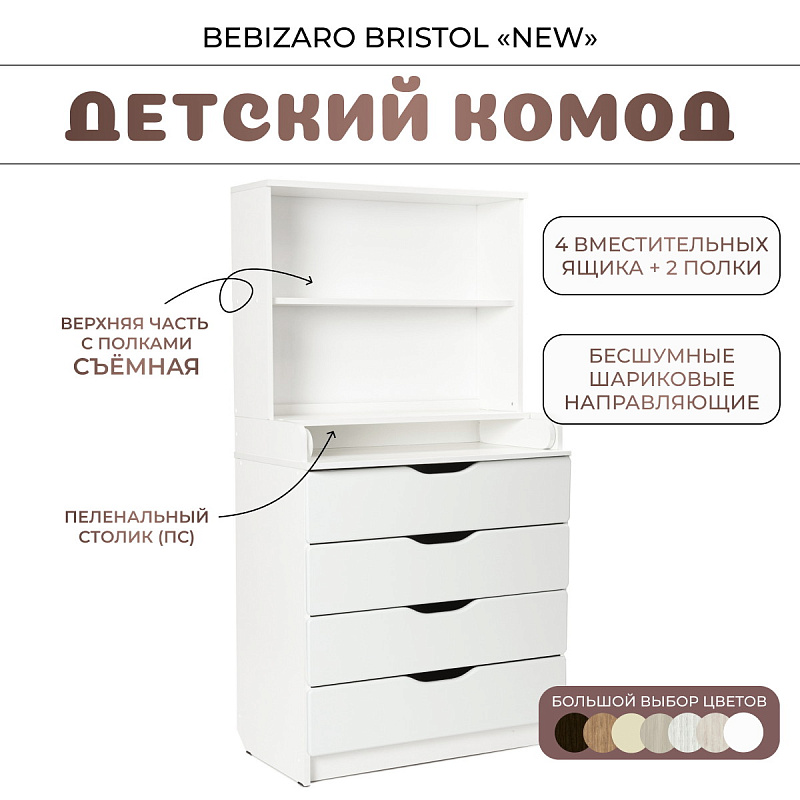 Детский пеленальный комод Bebizaro Bristol New (бебизаро бристоль новый) - большой, практичный комод с дополнительными полочками для хранения и складным пеленальным столиком. Такой комод поможет удобно организовать место для хранения детских вещей, косметики, игрушек. Складной пеленальный столик позволит маме удобно переодевать и пеленать малыша. 4 вместительных ящика удобно выдвигаются и задвигаются.