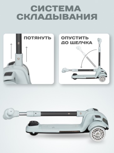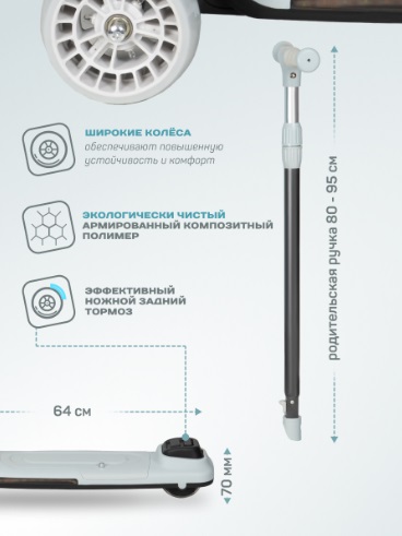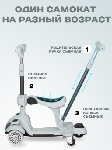 - Съемные детали: родительская ручка, сиденье, страховочные колесики.