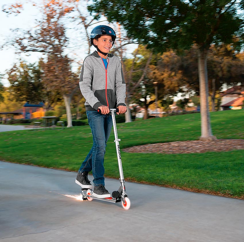 Детский самокат Razor Spark Ultra (рейзор спарк ультра) - красивый и очень яркий двухколесный самокат для детей от 4 лет и ростом от 100 см. Легкая алюминиевая рама легко складывается для транспортировки. Красочные светящиеся колеса не требуют элементов питания, а ночью обеспечат дополнительную безопасность ребенку. Фирменный искрогенератор в виде тормоз-педали над классическим тормоз-крылом сделает поездку не только удобной и быстрой, но и эффектной. Сноп искр вырывается под самокатом, завораживая окружающих. Это сделано по запатентованным технологиям и стандартам, так что будет абсолютно безопасно. Кончились искры? Не беда – сменный картридж можно докупить отдельно. Он легко заменяется за считанные секунды, после чего можно снова отправиться в яркое приключение!