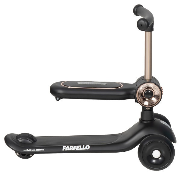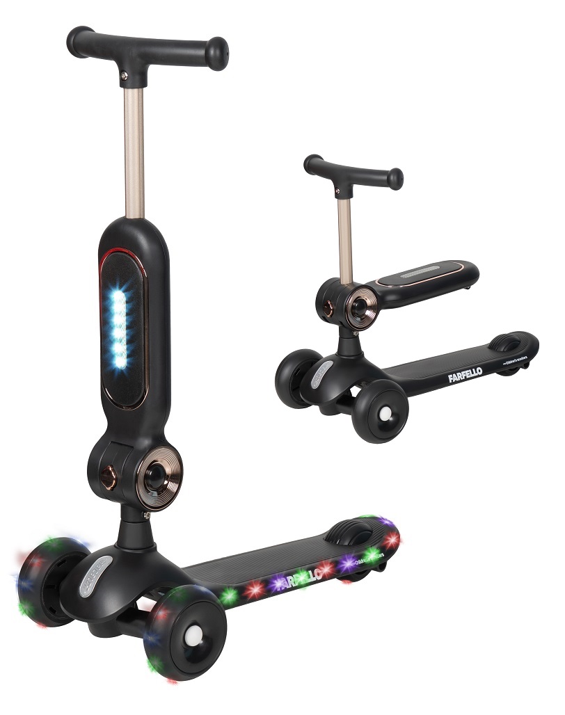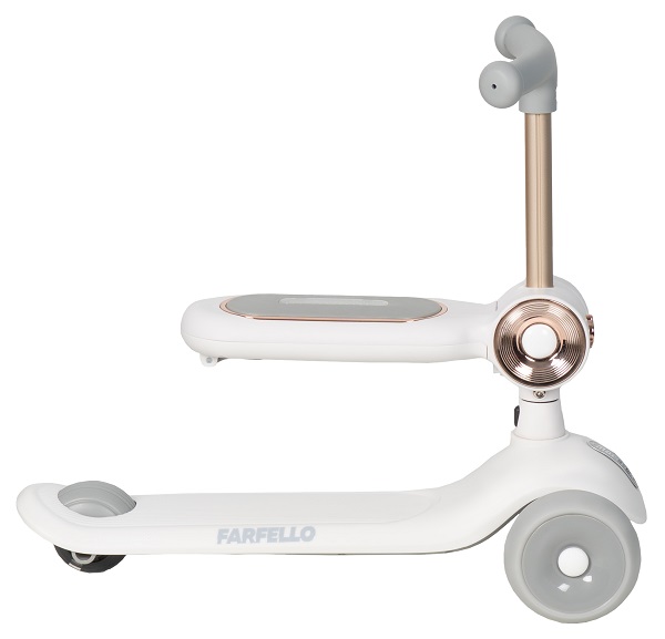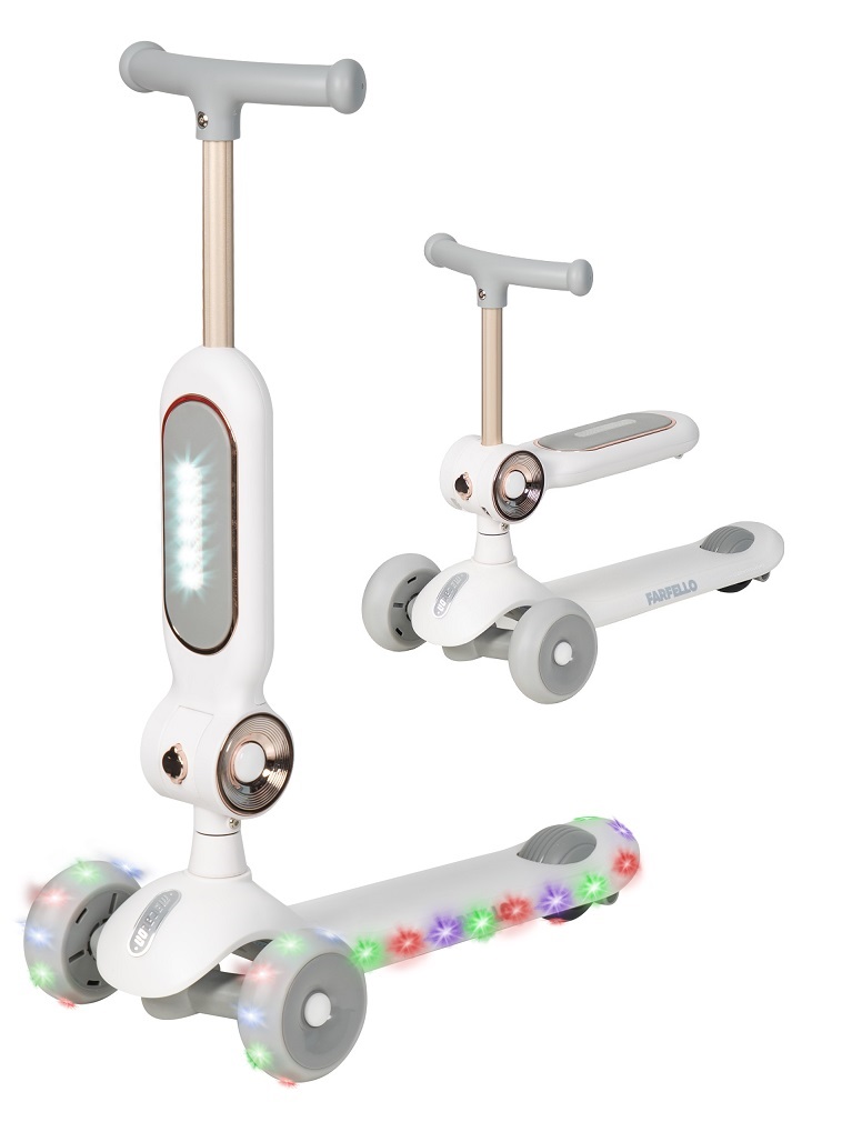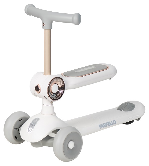 Детский самокат - трансформер Farfello A-7 (Фарфелло) - уникальный детский транспорт 2в1, который растет вместе с ребенком. Трехколесный самокат оснащен дополнительным сидением для ребенка от 1 годика. Пока малыш маленький, он может кататься на самокате сидя, как на каталке, толкаясь двумя ножками. А когда ребенок подрастет, сидение встраивается в руль и у ребенка получается полноценный трехколесный самокат с оригинальной подсветкой. Самокат яркий, стильный, удобный. Простое управление благодаря наклонам. Качественные PU колеса с подшипниками.