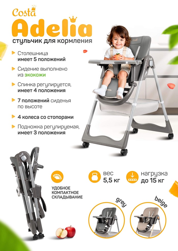 Продуманный дизайн стульчика позволит вписать стульчик в любой дизайн. Пластиковое сидение легко моется от любых загрязнений, а обивка из эко кожи протирается влажными салфетками или полностью снимается для стирки. Колеса позволят легко перемещать стульчик по кухне.