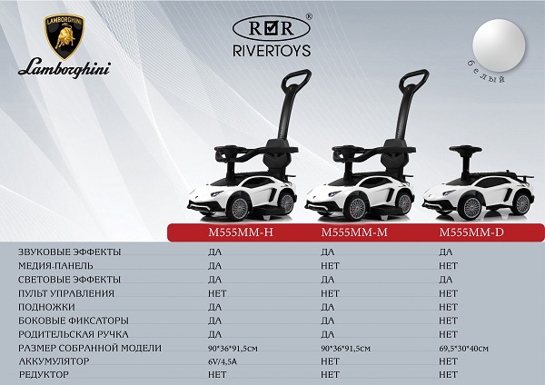 Детский толокар Rivertoys M555MM-D (ривертойс) - детская каталка-толокар с эффектным дизайном и эмблемой Ламборджини. Прекрасно подойдет как первый транспорт для ребенка от 1 годика. Такая машинка позволит ребенку самостоятельно и быстро передвигаться по квартире или на улице, при этом укрепляются ноги, развивается баланс и координация, тренируется внимание.
