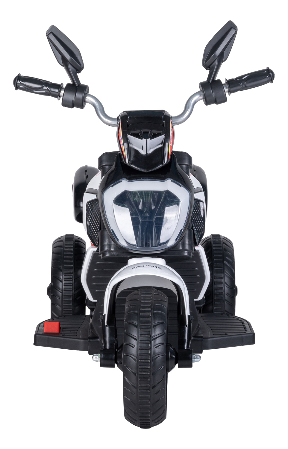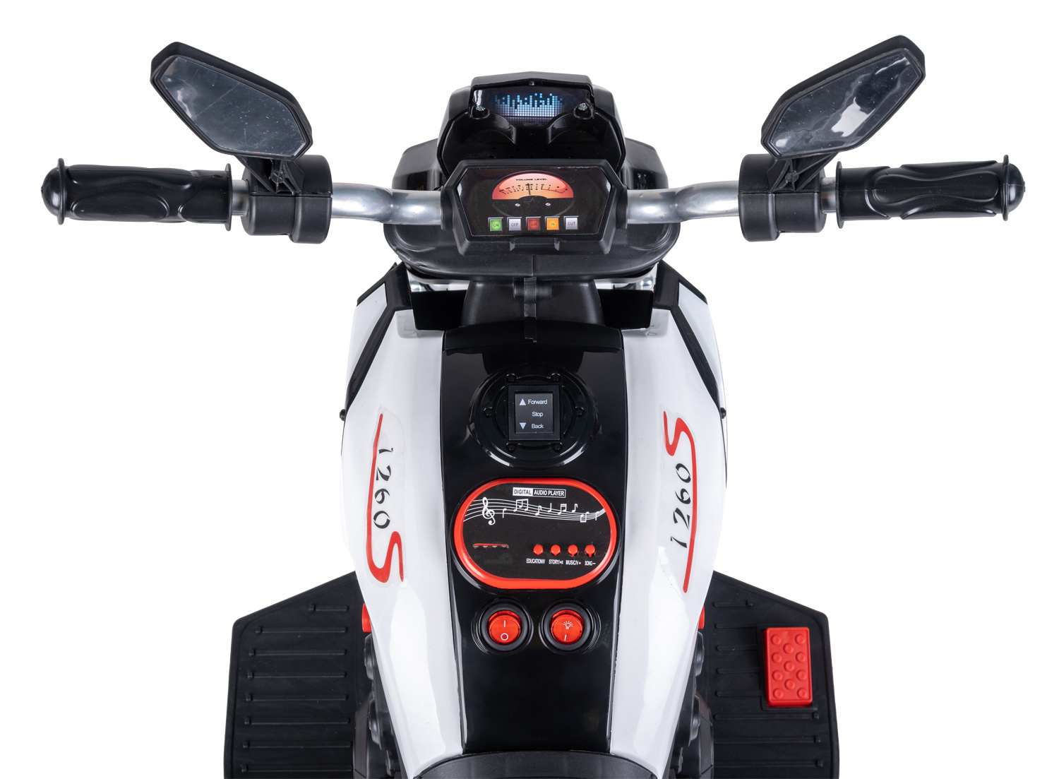 Транспорт приводится в движение нажатием кнопки на подножке. Переключение скорости вперёд/назад с помощью кнопки на панели у руля. Там же находится индикатор заряда батареи, включение музыки и регулировка громкости. Широкое сиденье и не скользкие подножки позволяют комфортно разместиться ребенку на электромобиле. Яркая подсветка включается отдельно, что экономит заряд батареи.