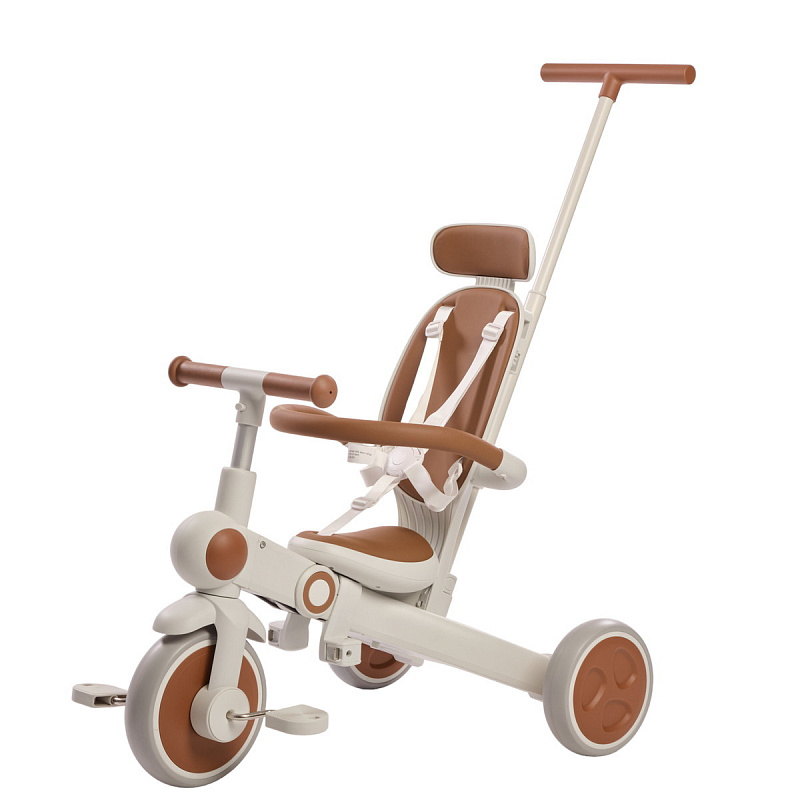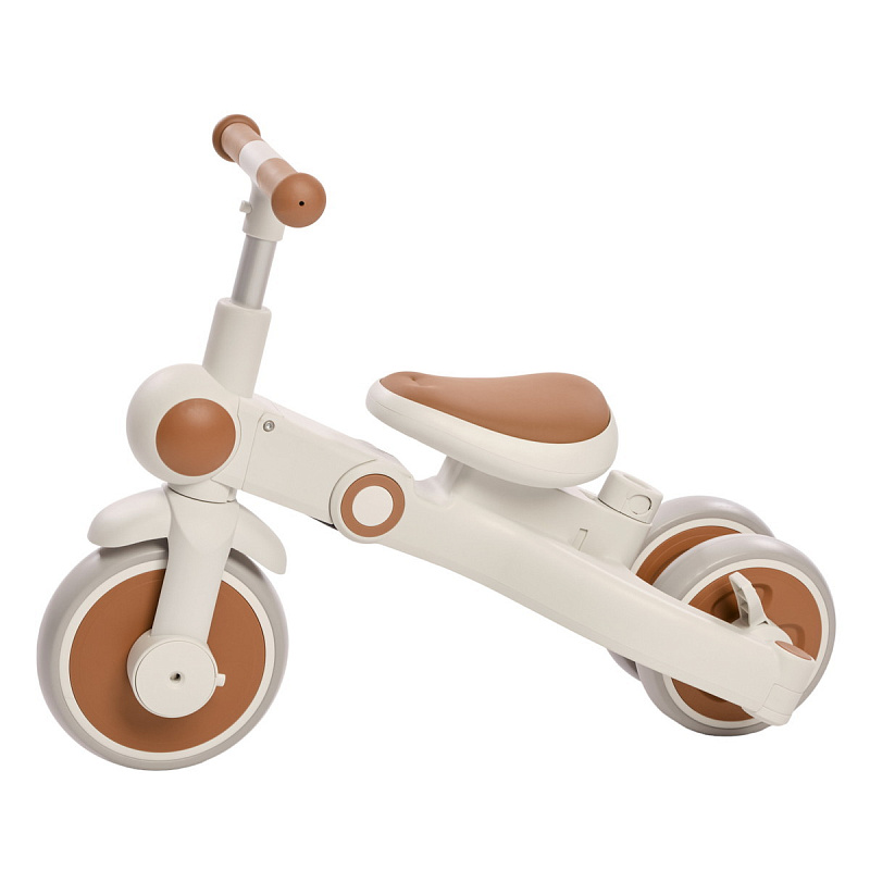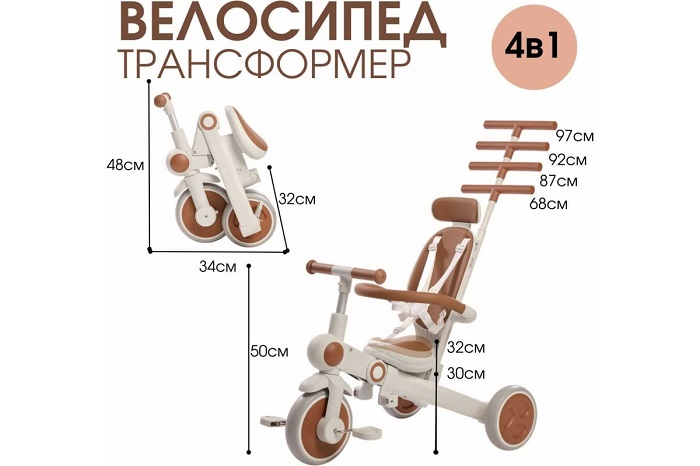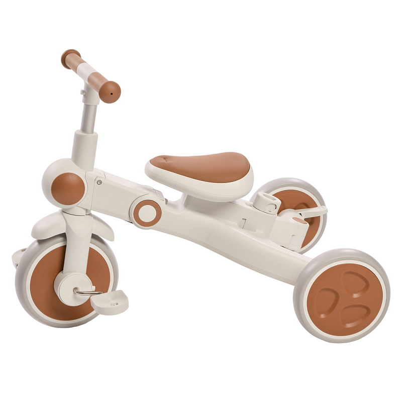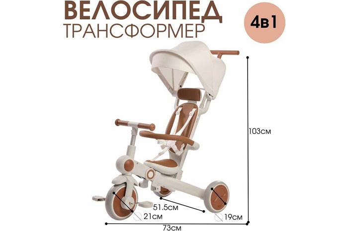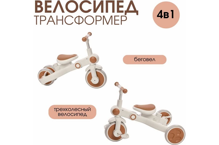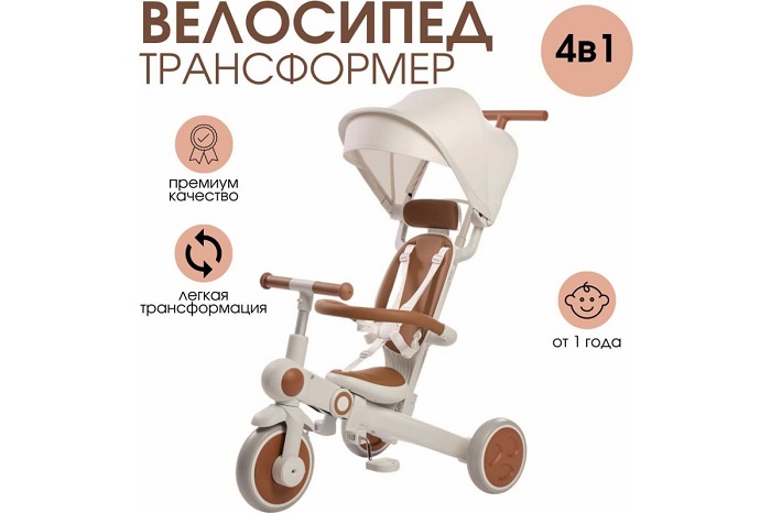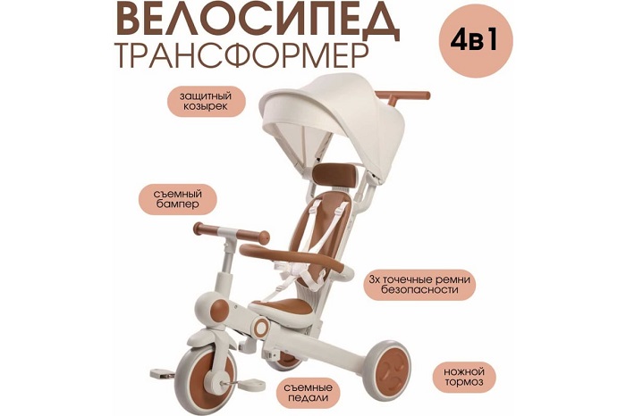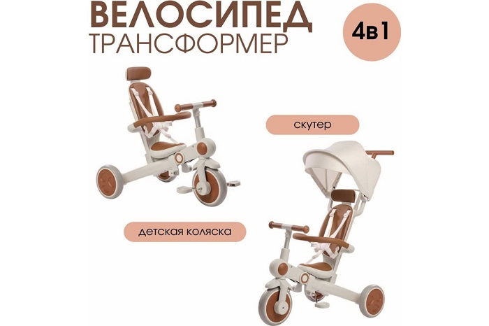 Велосипед – трансформер имеет множество вариантов трансформации. От удобного велосипеда-коляски до компактного беговела. При этом велосипед оснащен мягким сидением с высокой спинкой и регулируемым подголовником!, удобным капюшоном – тентом от солнышка, съемным бампером, съемными педалями, специальной подножкой для малышей, колесами которые могут соединяться для превращения велосипеда в беговел или каталку.