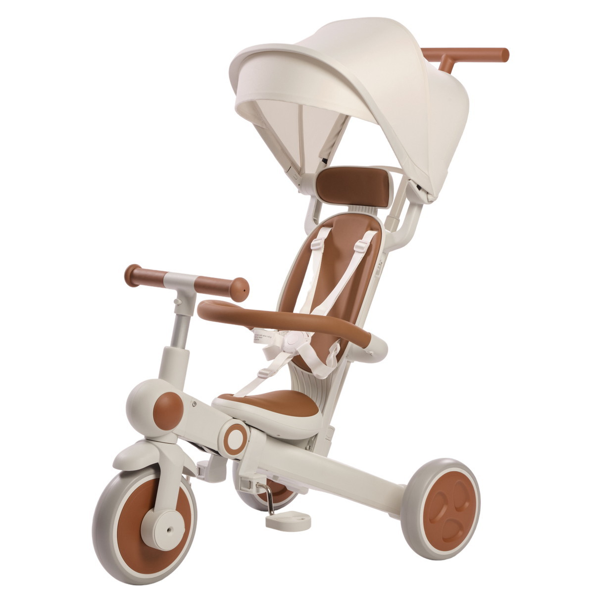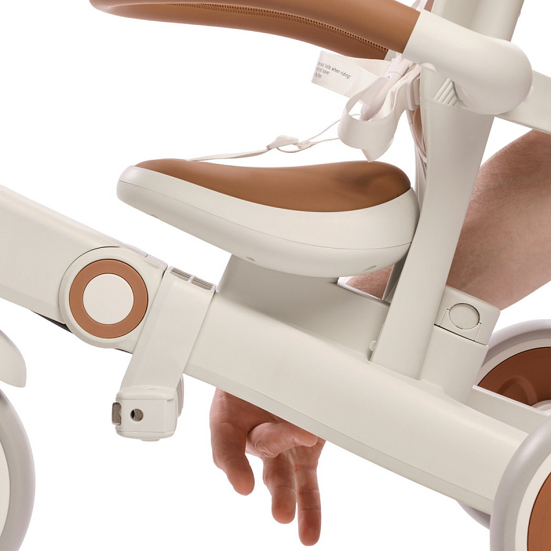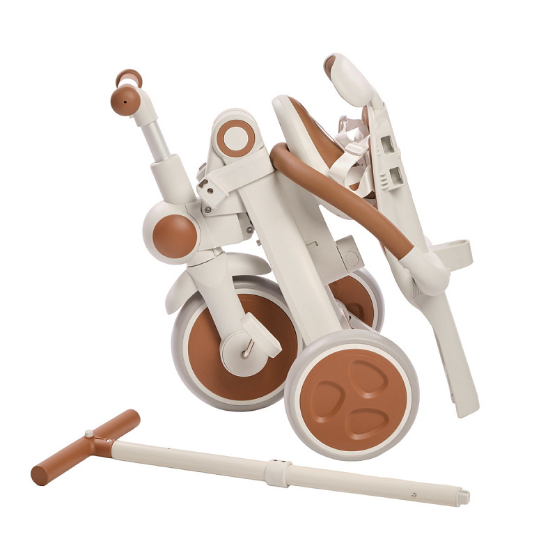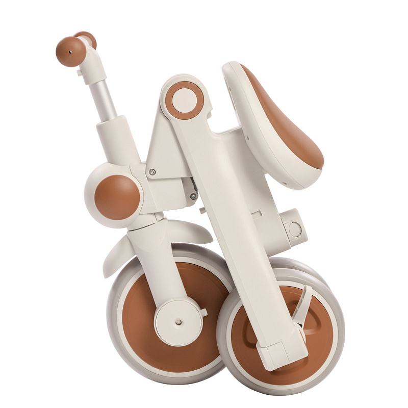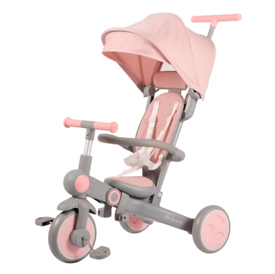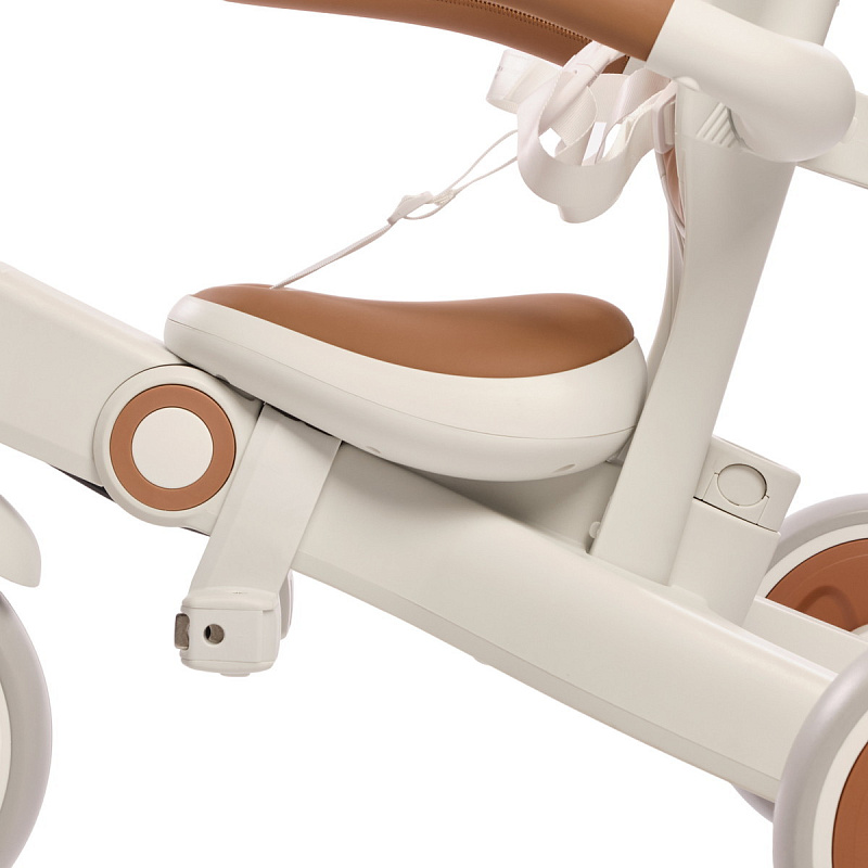 Велосипед – трансформер имеет множество вариантов трансформации. От удобного велосипеда-коляски до компактного беговела. При этом велосипед оснащен мягким сидением с высокой спинкой и регулируемым подголовником!, удобным капюшоном – тентом от солнышка, съемным бампером, съемными педалями, специальной подножкой для малышей, колесами которые могут соединяться для превращения велосипеда в беговел или каталку.