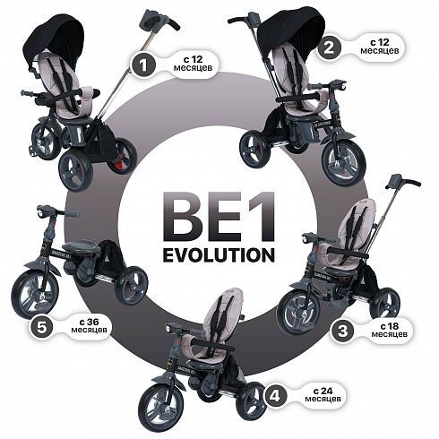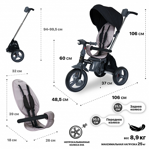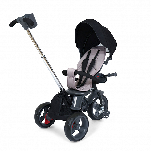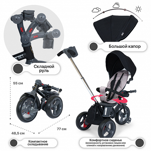 - Варианты использования: как летняя коляска для прогулок лицом к родителям, трехколесный велосипед с родительской ручкой управления, трехколесный велосипед для начинающих со складной подножкой (ребенок крутит педали, но управляют велосипедом родители), полноценный трехколесный велосипед, который полностью управляется ребенком.