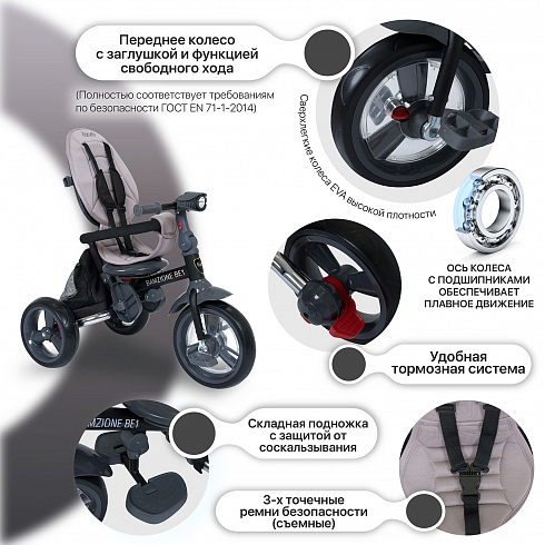 - На задних колесах имеются тормоза — во время остановки детский трехколесный велосипед Bamzione BE1 не сдвинется с места.