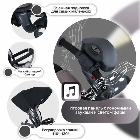 - Велосипед имеет светомузыкальную панель с имитацией звуков заводимого мотора и шума поездки, что приведет в восторг маленького гонщика.