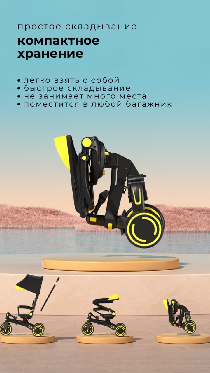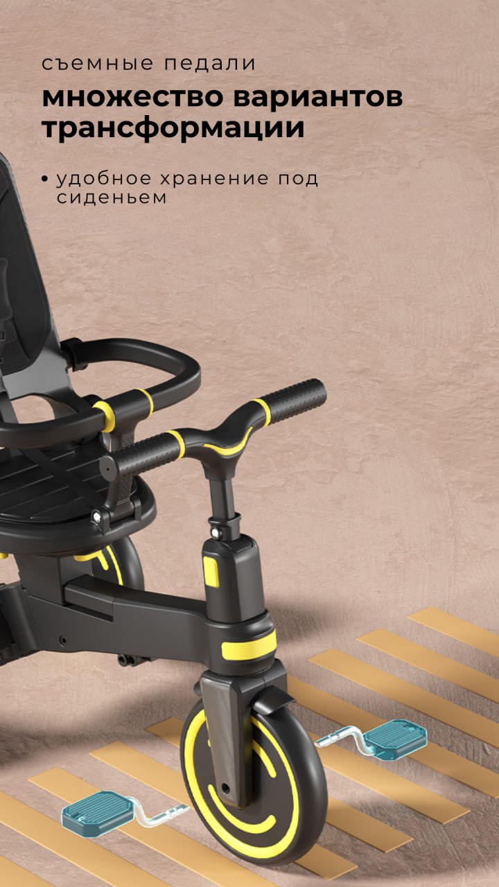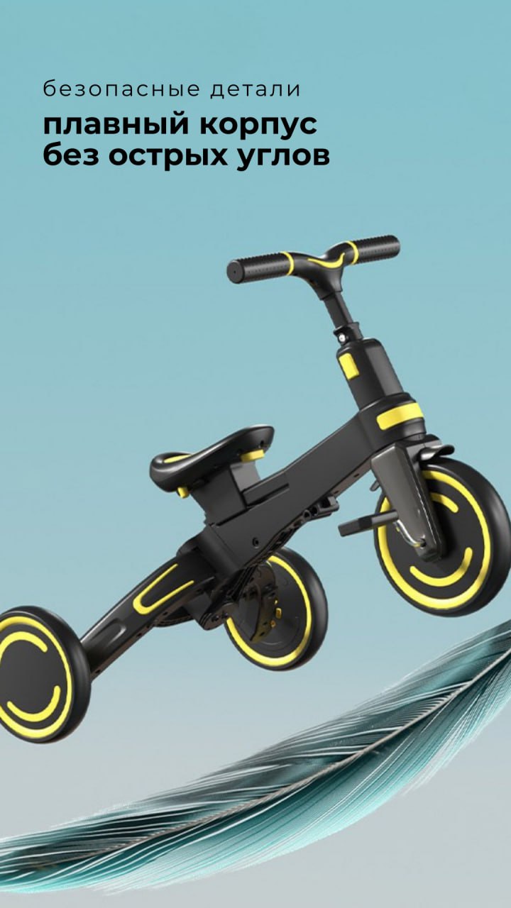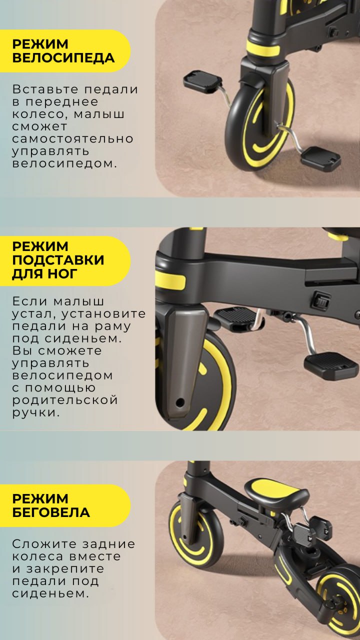 - Трансформируемое сиденье: широкое сиденье для малышей с бампером и спинкой легко снимается, сиденье поменьше используется в режимах беговел и велосипед для детей постарше