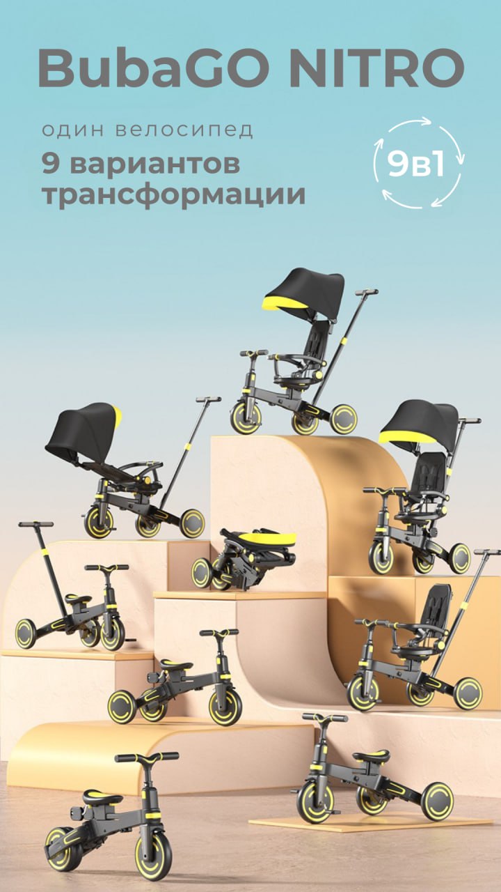 Детский велосипед - беговел BubaGO Nitro 9в1 (бубагоу нитро) - уникальный велосипед-трансформер, который идеально подойдет для ребенка от 1 до 5 лет. Он предоставит ребенку огромный функционал, удобное управление для родителей, легкий вес и компактное сложение для путешествий.